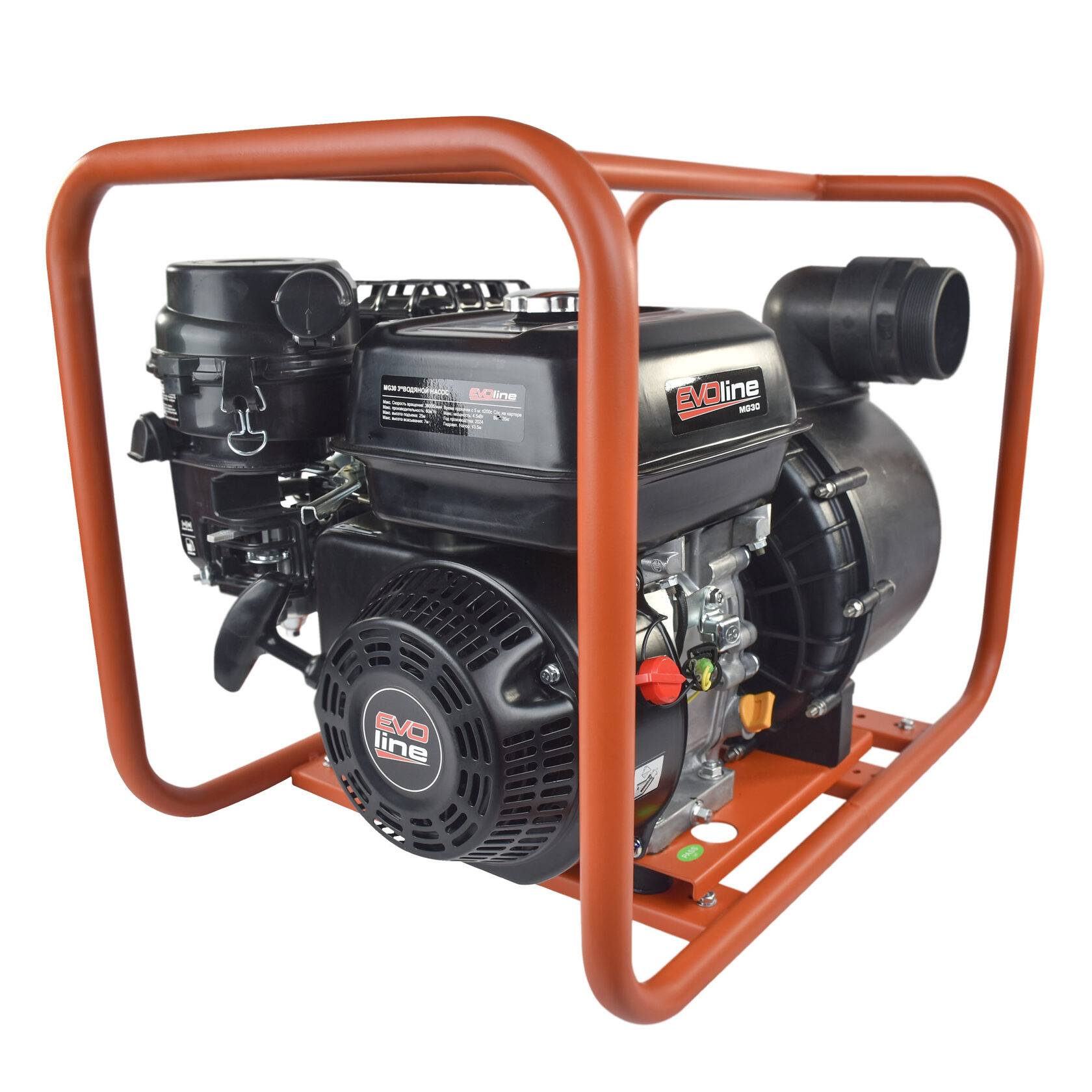 Бензиновая мотопомпа EVOline MG 30 для перекачки соленой воды и химических жидкостей с максимальным размером частиц до 6 мм. Данная насос имеет высокую производительность в 60 куб.метров в час (1000 л/мин), таких показателей удалось достичь за счет диаметров патрубков (80 мм) и двигателя Zongshen GB 225 с максимальной мощностью 7,5 л.с.