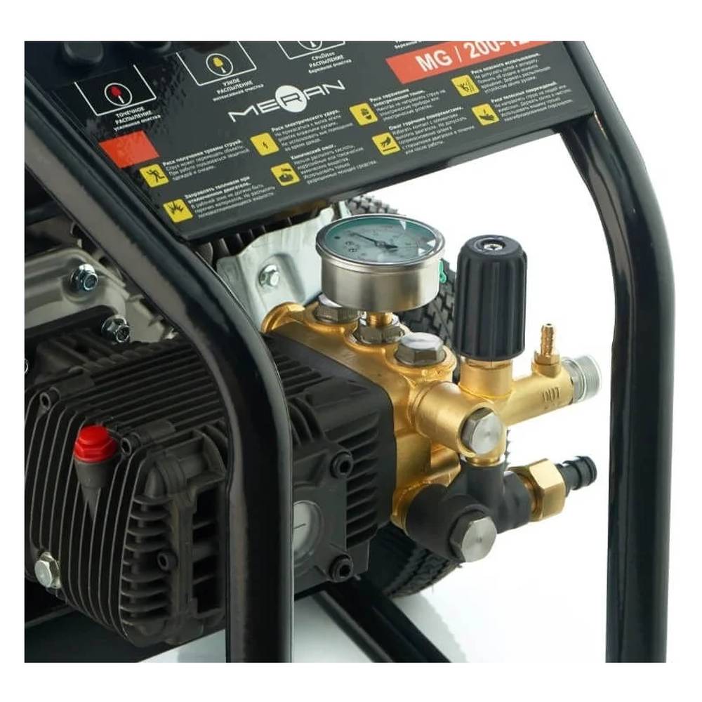 Мойка MERAN MG200-12 — это уже не просто аппарат, а профессиональный инструмент. Данная модель создана для интенсивного использования и больших нагрузок. Ее главное преимущество — промышленный плунжерный насос с керамическими поршнями и латунной головкой. Он отличается особой прочностью и рассчитан на долгую работу без поломок. Давление в 206 бар и производительность 12 л/мин справятся с любыми загрязнениями.