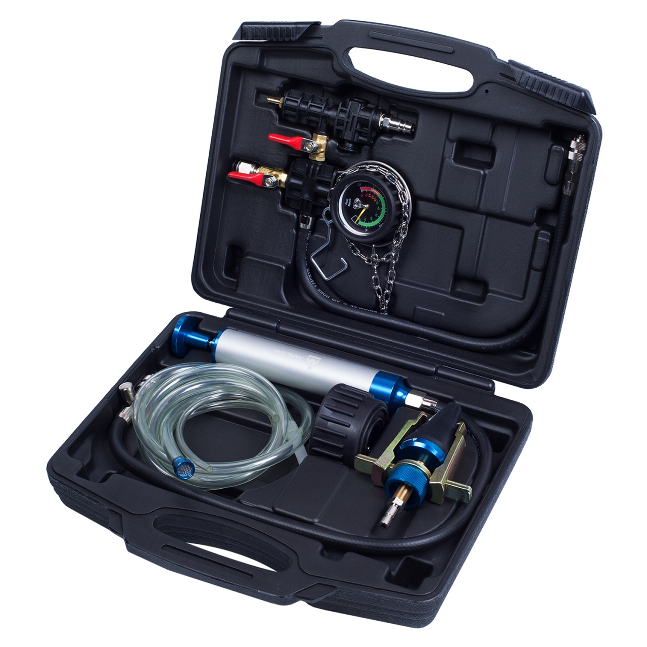 Набор предназначен для тестирования герметичности системы охлаждения двигателей автомобилей, а также заправки радиатора охлаждающей жидкостью с использованием вакуумного устройства. Универсальный адаптер для горловины радиатора и расширительного бачка, входящий в состав набора, применим к автомобилям марок MB, GM, Jeep, Peugeot, Subaru, Chrysler, Acura, Mitsubishi, Nissan, Mazda, Toyota, Infiniti, Geo, Suzuki, Isuzu, Honda, Acura, Lexus, Volvo, Saab, Citroen, Renault, Fiat, Alfa, Mini Cooper, VW, BMW, Ford, Opel, Porsche, Audi и др.
