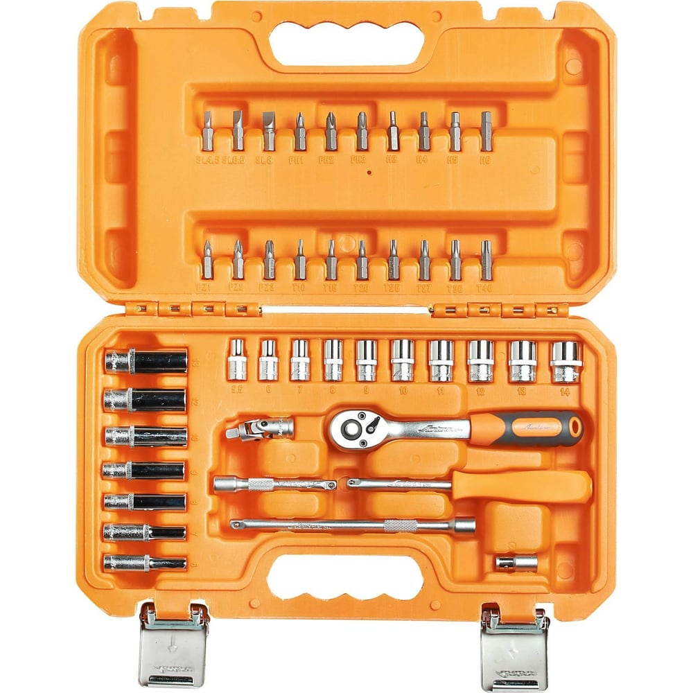 Набор головок и принадлежностей 1/4 43 предмета в пластиковом кейсе Airline AT-43-01. Инструменты соответствуют высоким стандартам качества, поэтому подойдут как для использования на бытовом уровне, так и для применения в профессиональной сфере. Инструменты изготовлены из высококачественной хром-ванадиевой стали. Металлические части изготовлены методом горячей ковки, что придаёт им высокую прочность и долговечность. Финишное прочное хромированное покрытие защищает Инструмент от воздействия коррозии, делает его более износостойким и легко очищается от загрязнений. Финишная обработка двух типов (частичная полировка) головок придаёт им отличный внешний вид. Продуманный профиль рабочей части торцевых головок смещает пятно контакта с ребра грани на её поверхность, что предотвращает повреждение болтов и гаек даже при самых высоких нагрузках. Эргономичный профиль рукояток приводов и воротков позволяет развивать большее усилие без риска повреждения кистей рук. Надёжный трещоточный механизм на 72 зуба значительно повышает производительность труда и снижает нагрузки на организм. Материал: cталь CrV50BV30 Твёрдость: 45-48 HRC Покрытие: Матовое хромирование с частичной полировкой Артикул: AT-43-01 OEM номера: 39946, 610745, S68H2141S, OMT30S Состав: металл/пластик Размер: 6гр. 5.5, 6, 7, 8, 9, 10, 11, 12, 13, 14