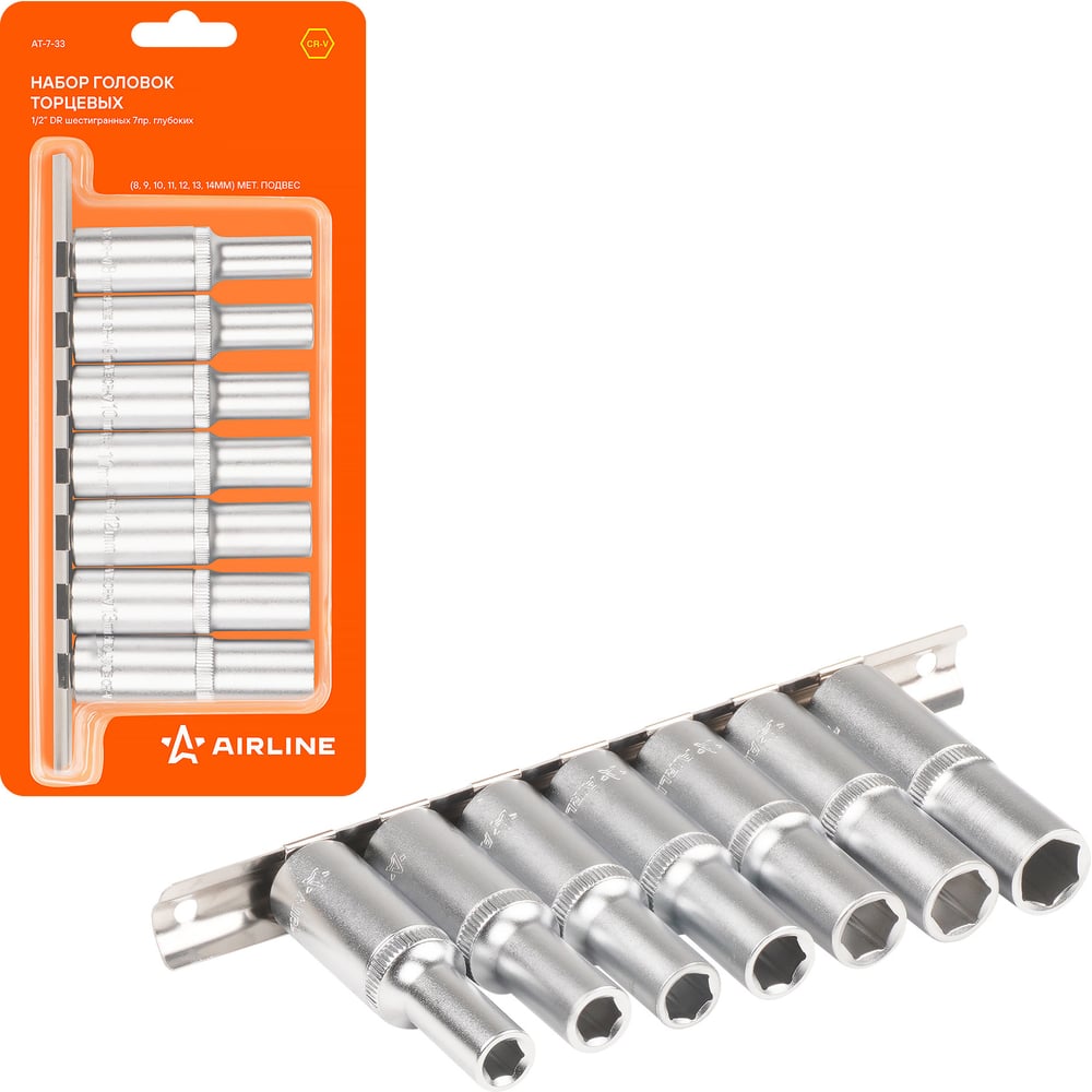 Набор головок торцевых 1/2" DR шестигранных 7пр. глубоких (8,9,10,11,12,13,14мм) AIRLINE AT-7-33 Головки торцевые изготовлены из высококачественной хром-ванадиевой стали. Металлические части изготовлены методом горячей ковки, что придаёт им высокую прочность и долговечность. Финишное прочное хромированное покрытие защищает инструмент от воздействия коррозии, делает его более износостойким и легко очищается от загрязнений. Финишная обработка двух типов (частичная полировка) головок придаёт им отличный внешний вид. Продуманный профиль рабочей части торцевых головок смещает пятно контакта с ребра грани на её поверхность, что предотвращает повреждение болтов и гаек даже при самых высоких нагрузках. Артикул: AT-7-33 Состав: металл/пластик Размер:: 8,9,10,11,12,13,14мм
