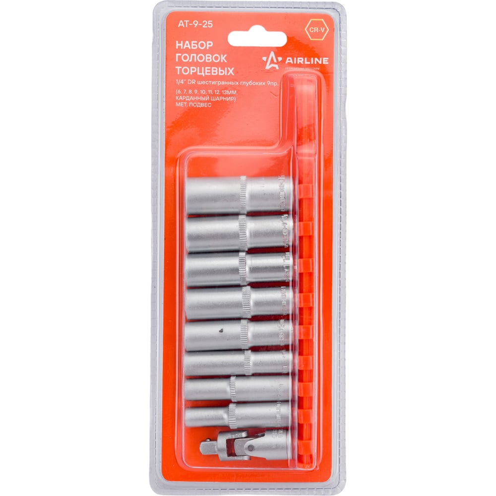 Набор головок торцевых 1/4" DR шестигранных глубоких 9пр. (6,7,8,9,10,11,12,13мм, карданный шарнир) AIRLINE AT-9-25 Головки торцевые изготовлены из высококачественной хром-ванадиевой стали. Металлические части изготовлены методом горячей ковки, что придаёт им высокую прочность и долговечность. Финишное прочное хромированное покрытие защищает инструмент от воздействия коррозии, делает его более износостойким и легко очищается от загрязнений. Продуманный профиль рабочей части торцевых головок смещает пятно контакта с ребра грани на её поверхность, что предотвращает повреждение болтов и гаек даже при самых высоких нагрузках. Артикул: AT-9-25 OEM номера: 600313, 914110 Состав: металл/пластик Размер:: 6,7,8,9,10,11,12,13мм
