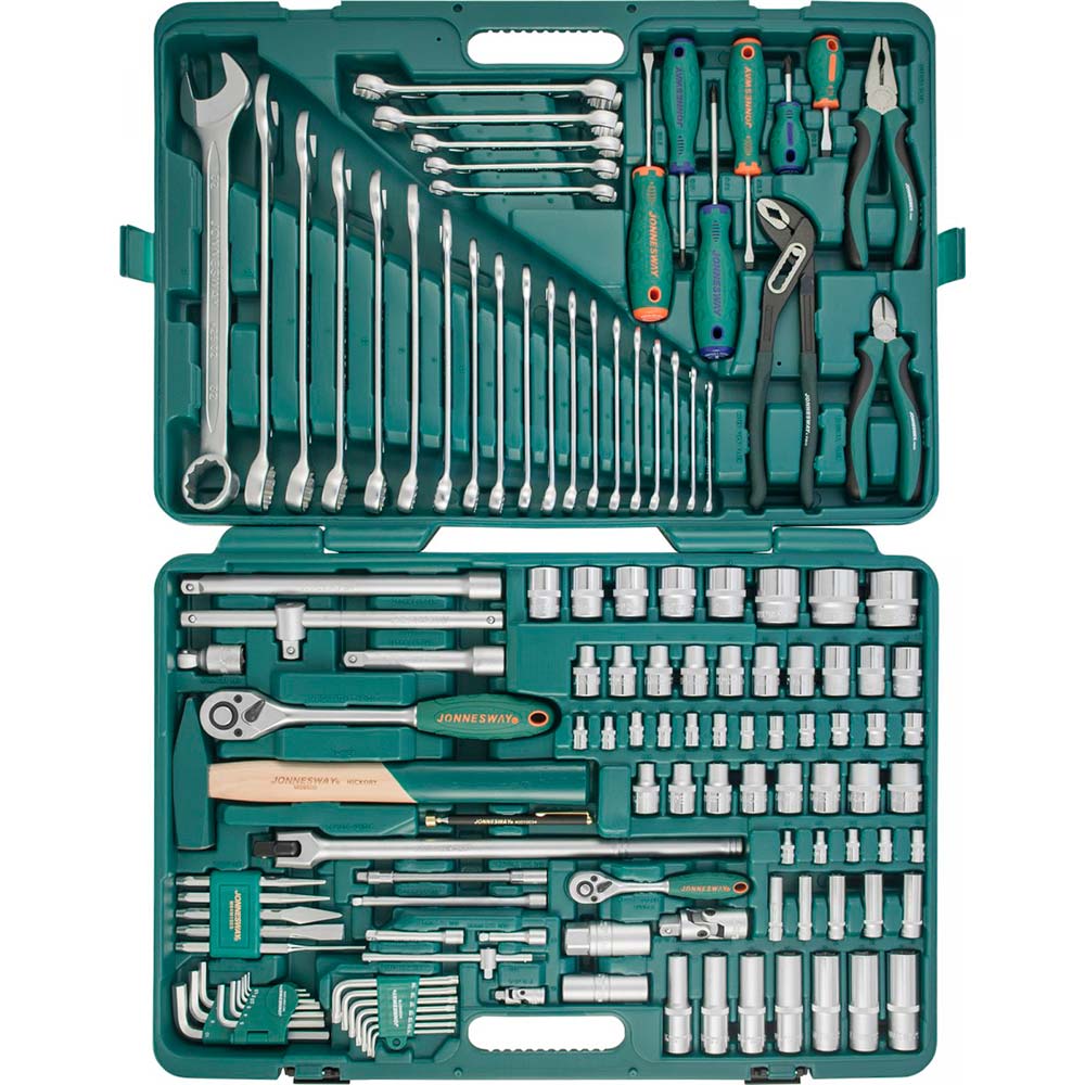 Набор инструмента Jonnesway 127 предметов (кейс) применяется для производства комплексных слесарно-монтажных работ по монтажу, ремонту, техническому обслуживанию. В набор входит: Головка торцевая 1/4"DR - 12шт (4, 4.5, 5, 5.5, 6, 7, 8, 9, 10, 11, 12, 13мм); Головка торцевая глубокая 1/4"DR - 5шт (7, 8, 10, 12, 13мм); Головка торцевая 1/4"DR внешний TORX - 5шт (Е4, Е5, Е6, Е7, Е8); Головка торцевая 1/2"DR - 18шт (8, 9, 10, 11, 12, 13, 14, 15, 16, 17, 18, 19, 21, 22, 24, 27, 30, 32мм); Головка торцевая глубокая 1/2"DR - 7шт (10, 12, 13, 14, 15,17, 19мм); Головка торцевая 1/2"DR внешний TORX - 8шт (Е10, Е12, Е14, Е16, Е18, Е20, Е22, Е24); Головка торцевая свечная 1/2"DR - 2шт (16 и 21мм); Удлинитель 1/4"DR 50мм; Удлинитель с шаром 1/4"DR - 2шт (50 и 150мм); Удлинитель гибкий 1/4"DR; Удлинитель 1/2"DR - 2шт (125 и 250мм); Удлинитель с шаром 1/2"DR 50мм; Шарнир карданный 1/4"DR; Шарнир карданный 1/2"DR; Вороток Т-образный 1/4"DR 130мм; Вороток Т-образный 1/2"DR 250мм; Рукоятка трещоточная 1/4"DR 36 зубцов 146мм; Рукоятка трещоточная 1/2"DR 36 зубцов 278мм; Ключ гаечный комбинированный - 19шт (6, 7, 8, 9, 10, 11, 12, 13, 14, 15, 16, 17, 19, 21, 22, 24, 27, 30, 32мм); Ключ гаечный разрезной - 5шт (8х10, 9х1, 12х13, 14х17, 17х19мм); Ключи торцевые шестигранные - 9шт (1.5-10мм); Ключи торцевые Torx - 7шт (Т10-Т40); Набор выколоток, кернов и зубил - 5шт; Отвертка стержневая шлицевая "ANTI-SLIP GRIP" - 6шт ( SL6.5х38, SL5.5х75, SL6.5х100, PH2х38, PH1х75, PH2х100); Молоток с деревянной рукояткой 500гр; Пассатижи 180мм CR-MO; Бокорезы 160мм CR-MO; Клещи переставные 250мм; Рукоятка магнитная телескопическая; Кейс пластиковый.