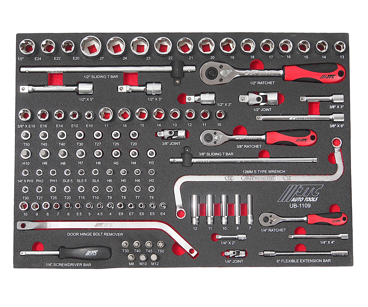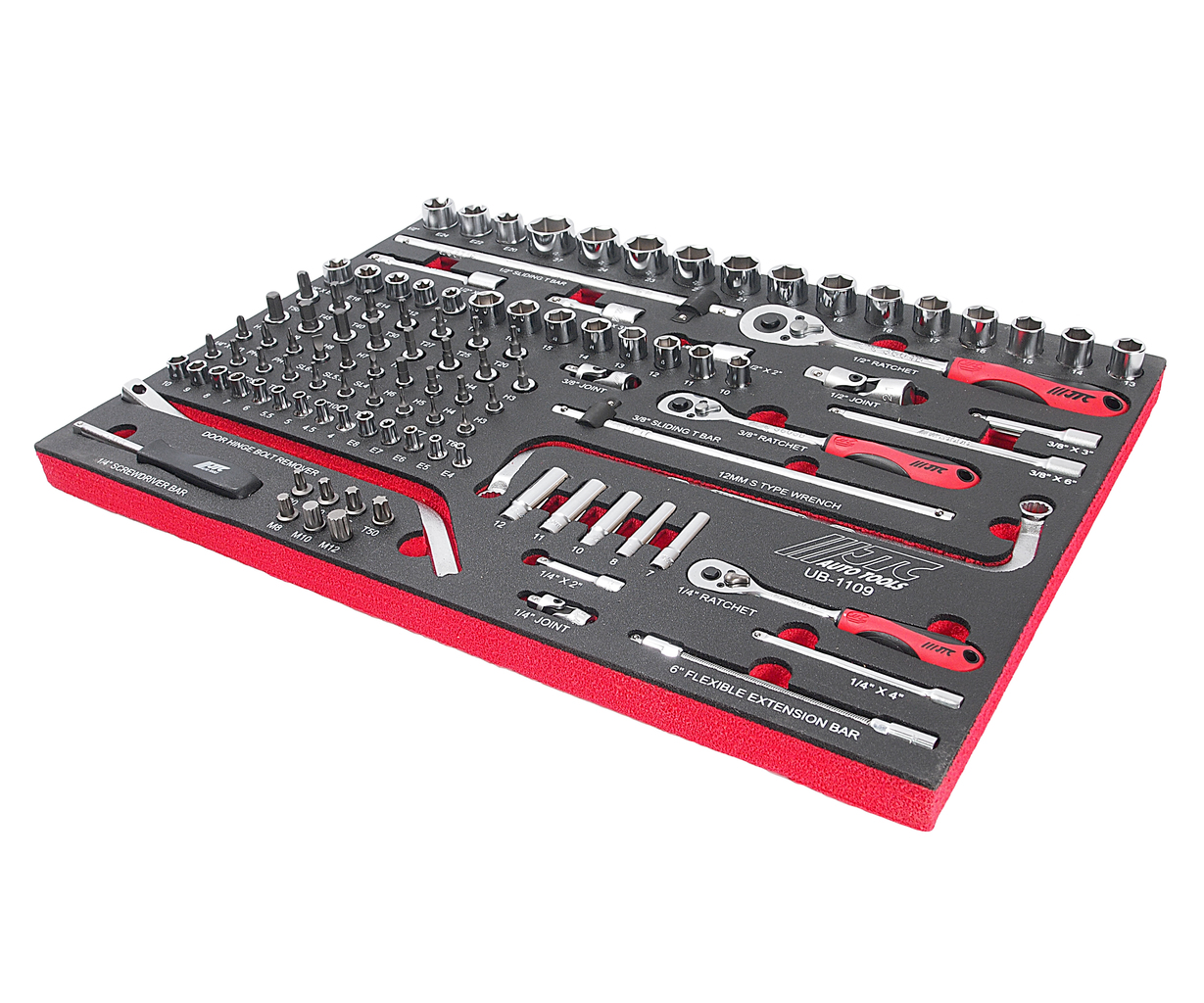 JTC-UB1109 — профессиональный универсальный набор инструментов из 109 предметов, предназначенный для выполнения широкого спектра слесарно-монтажных работ. Набор разработан для использования в автосервисах, производственных мастерских и профессиональных ремонтных работах. Набор полностью соответствует профессиональным стандартам качества и обеспечивает эффективное выполнение широкого спектра монтажных и демонтажных работ. Инструменты подходят для ежедневного интенсивного использования в условиях автосервиса или производственной мастерской.