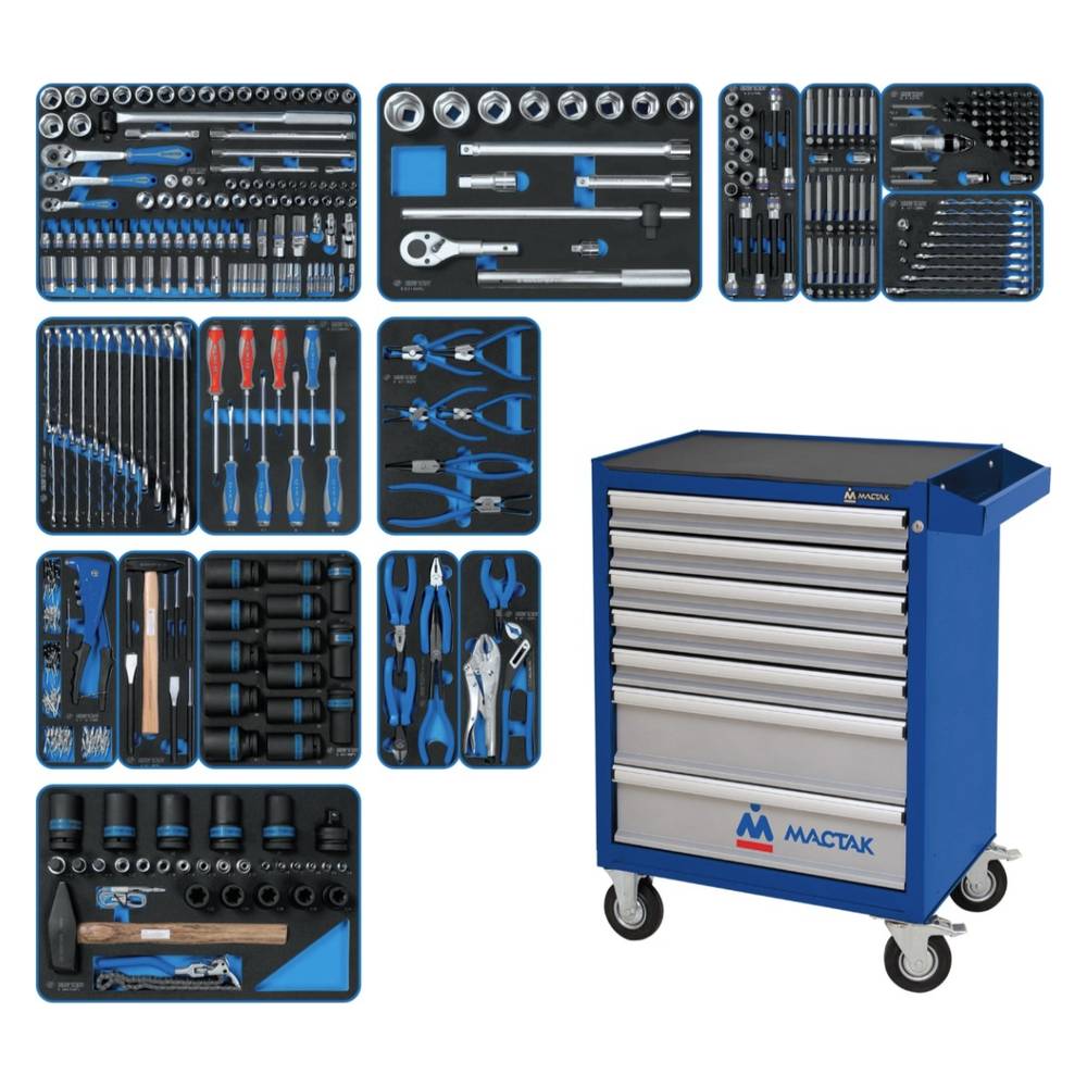 Набор инструментов KING TONY 934_327AMB «ACTION» (327 предметов) — профессиональный комплект в синей тележке для автосервисов и мастерских. Включает ключи, головки, насадки и принадлежности основных типоразмеров. Инструменты из хром_ванадиевой стали с антикоррозийным покрытием. Тележка с выдвижными ящиками обеспечивает удобство хранения и мобильность. Предназначен для интенсивной эксплуатации.