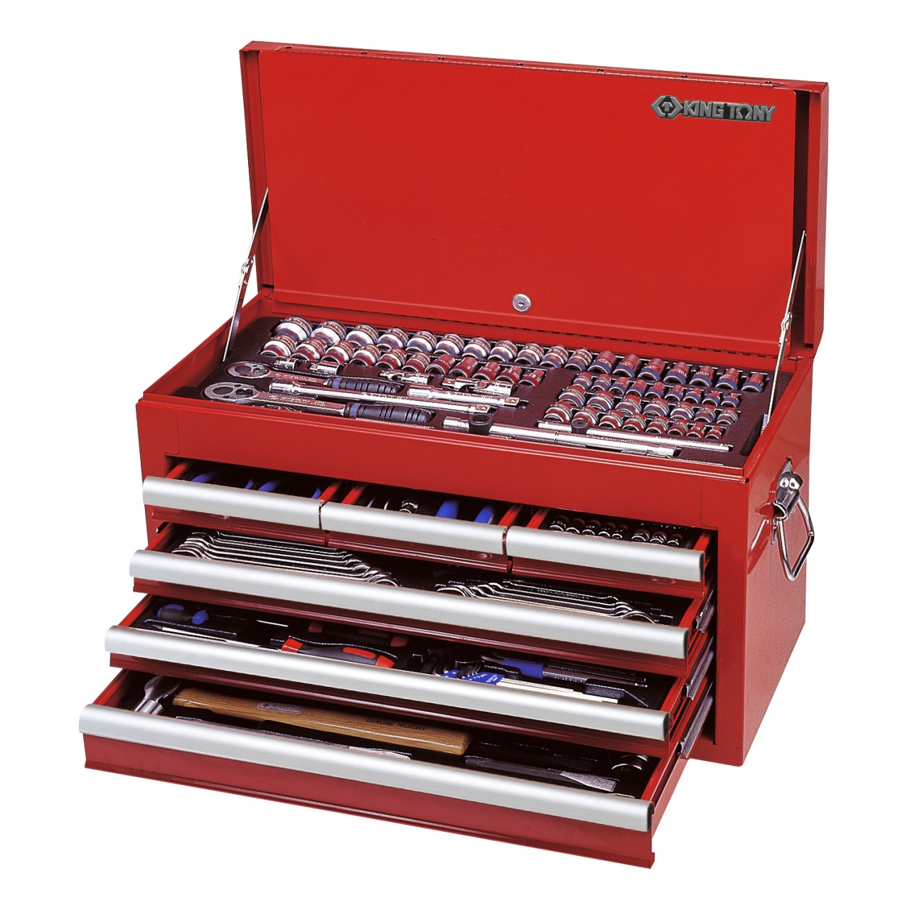 Набор инструментов марки KING TONY состоит из 219 предметов, и включает в себя ложементы, размещённые в инструментальном ящике. Каждый ложемент расположен на своей полке, что позволяет содержать инструмент в полном порядке. Комплектация набора включает в себя всё необходимое для организации рабочего места в любом производственном помещении, станции технического обслуживания или авторемонтной мастерской.