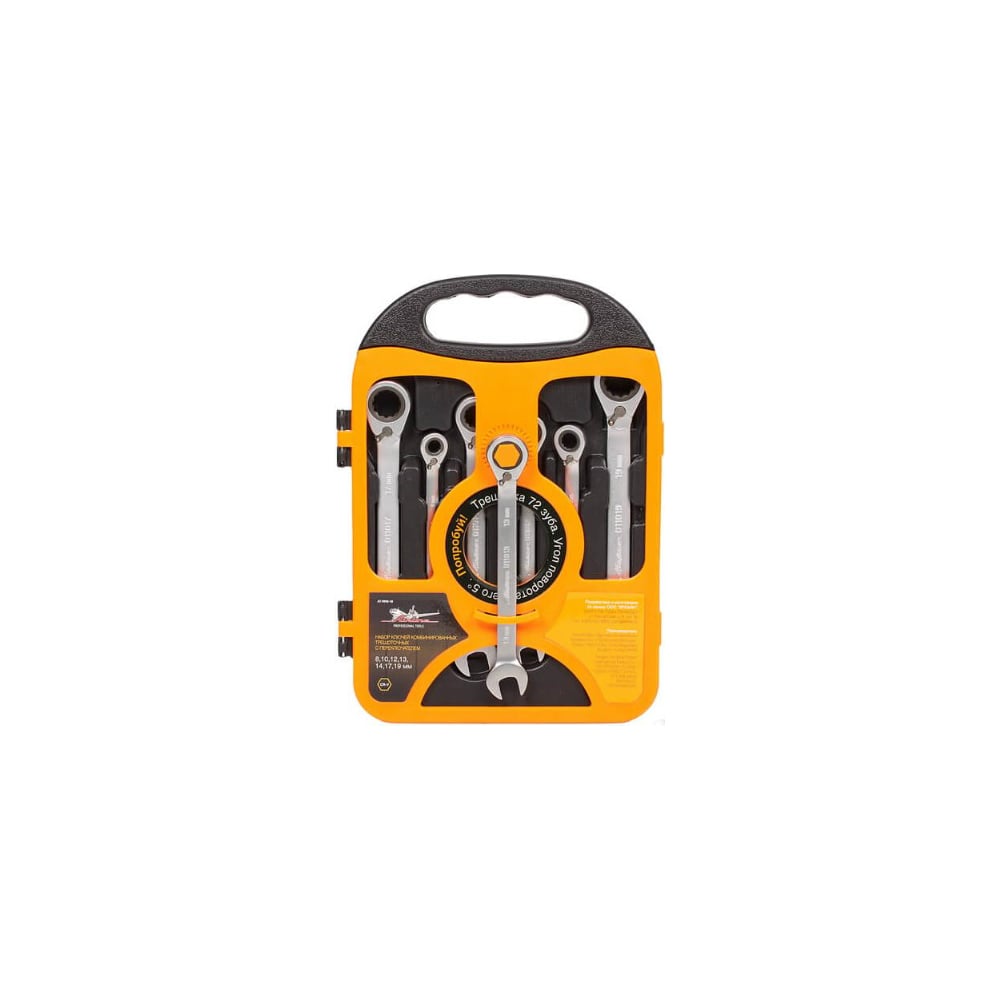 Набор комбинированных трещоточных ключей с переключателем 7предметов 8,10,12,13,14,17,19мм пластиковый пенал Airline AT-RRS-16 дополнительно оснащен шарниром, который обеспечивает удобство вращения крепежа в ограниченном пространстве. Двенадцатигранная головка и храповик с 72-я зубцами существенно упрощает процесс вращения крепежа. Угол вращения составляет всего 5 градусов. Специальный переключатель направления вращения позволяет изменить его, не переворачивая ключа.