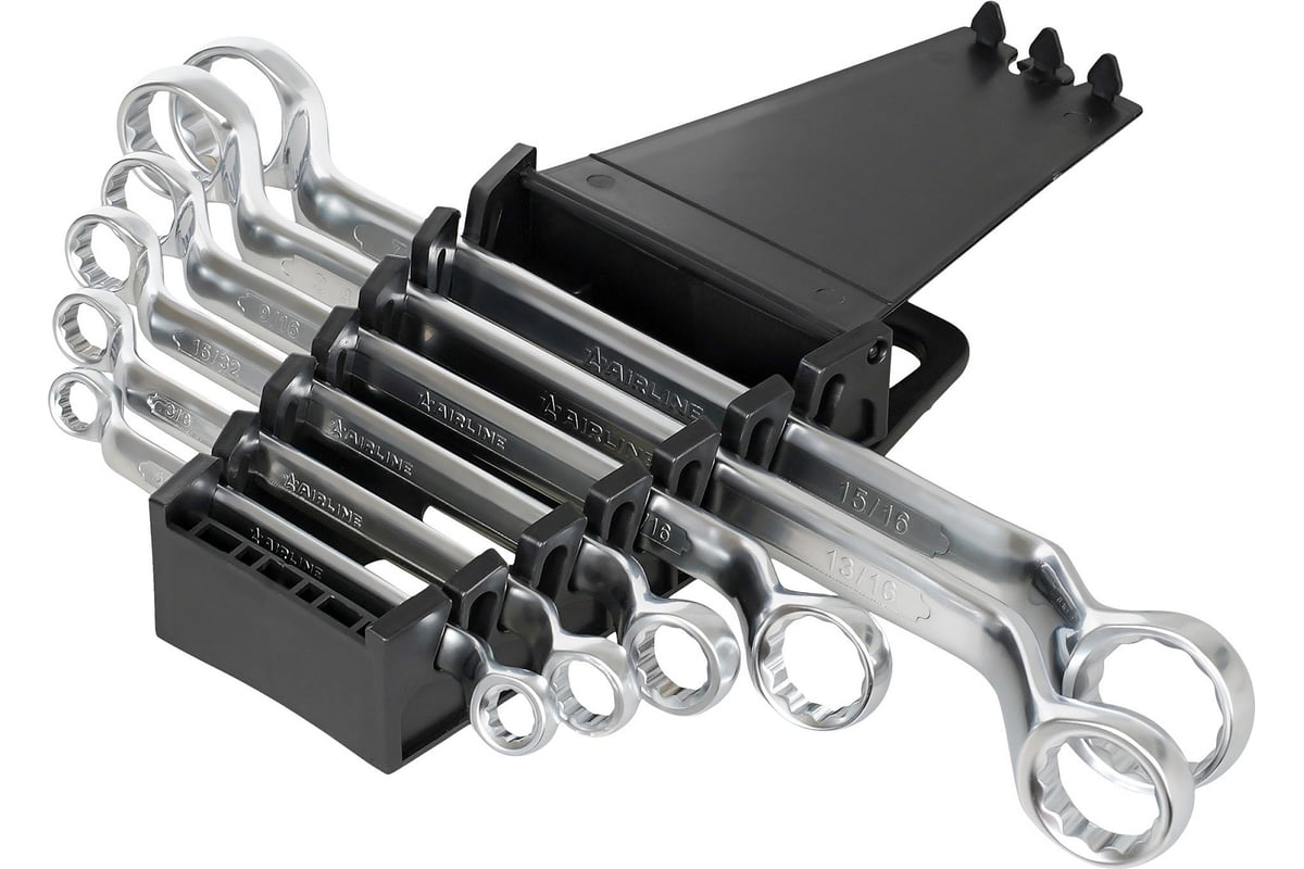 Набор ключей накидных дюймовых PRO 6пр. (5/16"-15/16") холдер AIRLINE ATAF109 Ключи накидные с изгибом серии PRO изготовлены из высококачественной хромованадиевой стали, отличаются высоким запасом прочности, износостойкостью и долговечностью эксплуатации. Способны выдерживать самые интенсивные нагрузки при непрерывной длительной работе. Финишное хромированное покрытие защищает ключ от воздействия коррозии. Эргономичный рукоятка развивает большее усилие без риска повреждения кистей рук. Продуманный профиль накидной части ключа предотвращает повреждение болтов и гаек, даже при самых высоких нагрузках. Абсолютно все ключи производятся по единой технологии на современных автоматизированных предприятиях. Тестирование каждого ключа происходит в собственной испытательной лаборатории в два этапа, что является залогом качества. Надежные и прочные ключи серии PRO станут незаменимым инструментом для любого профессионала.