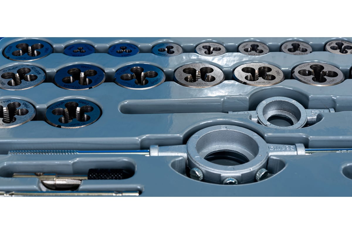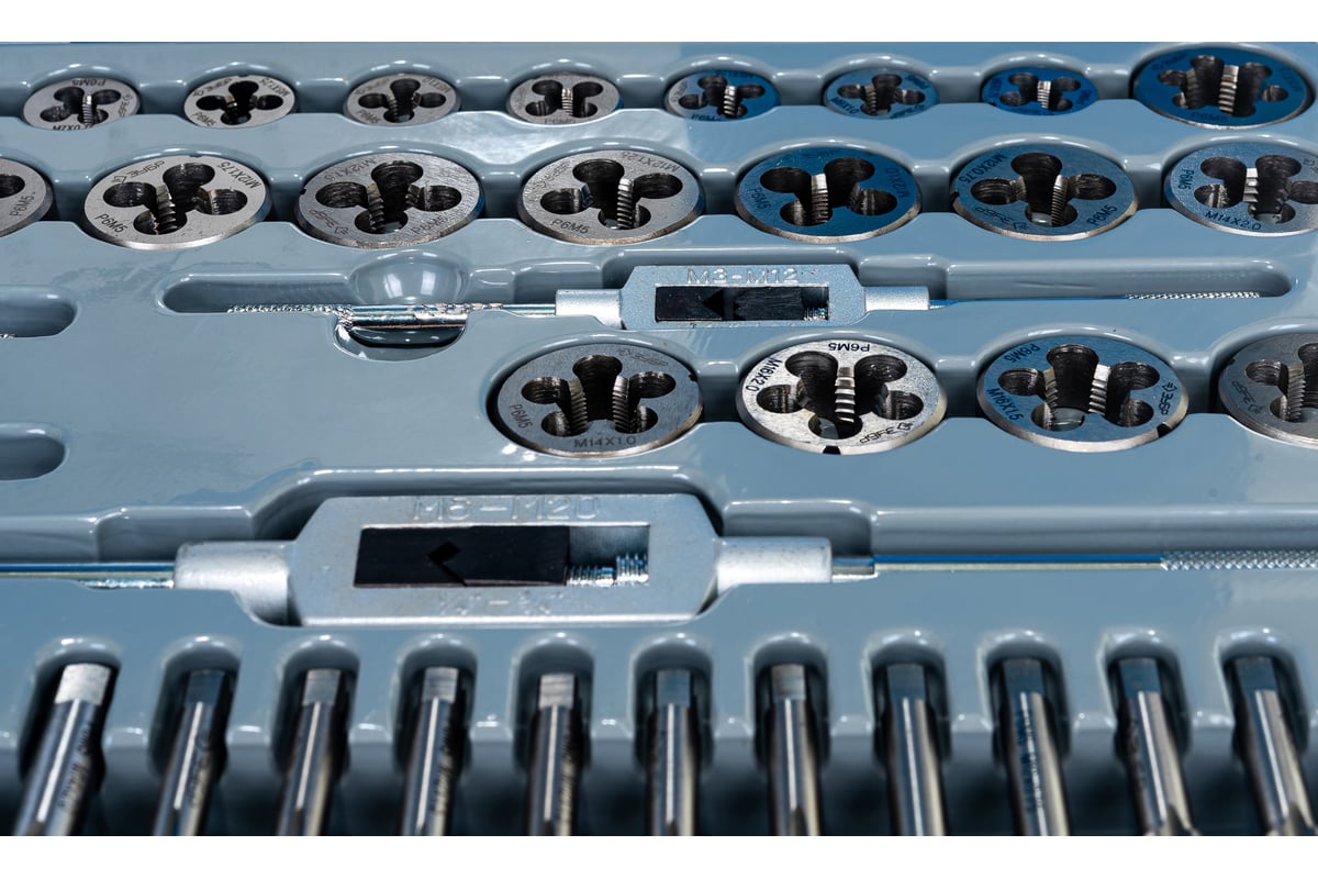 Набор метчиков и плашек "ПРОФЕССИОНАЛ", сталь Р6М5, 110 предметов ЗУБР 28110-H110 включает в себя большое количество резьбонарезного инструмента.