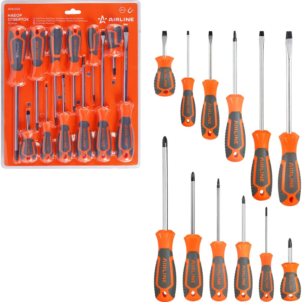 Набор отвёрток предназначен для работ с крепежом. Сочетание твёрдых и мягких элементов рукоятки оптимально распределяет усилие, прилагаемое к инструменту, и предотвращает проскальзывание. Эргономичный дизайн облегчает работу. Отвёртки удобно подвешиваются за специальное отверстие. Лезвие отвёрток изготовлено из хром-ванадиевой стали, жало подвержено индукционной закалке и фосфатировано.