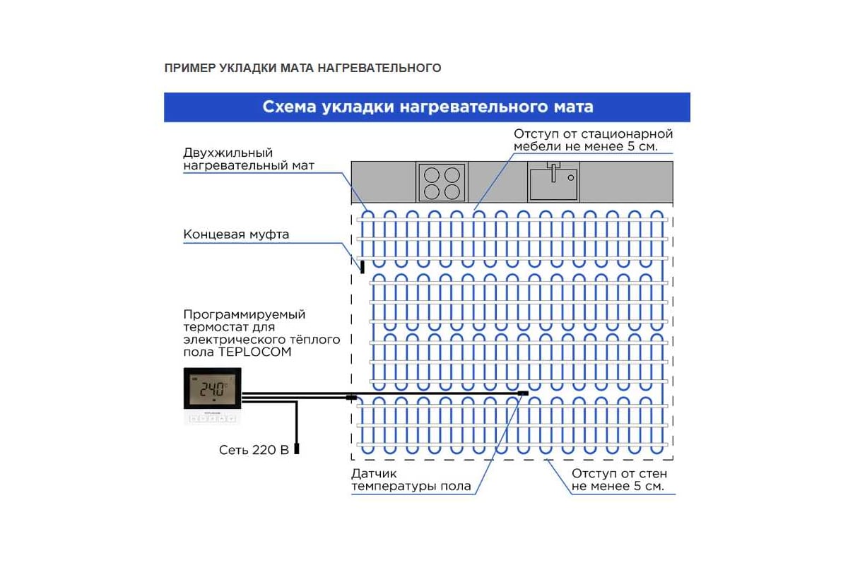 Удобная, с постоянным шагом раскладка кабеля на сетке позволяет осуществить легкий и быстрый монтаж на любых поверхностях. Мат можно легко разрезать на фрагменты (не нарушая целостности кабеля), что позволяет разложить его на обогреваемой площади любой формы. Возможность укладки во влажных помещениях.