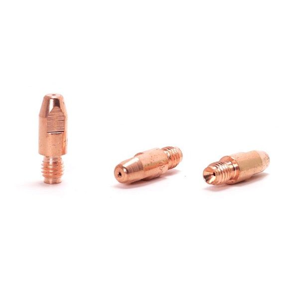 Наконечник – расходная часть MIG/MAG горелки, которая обеспечивает токосъём в процессе сварки, поэтому наконечники, так же называют контактными. Кроме того, через наконечник в процессе сварки подаётся проволока. Для оптимальной работы и идеального контакта необходимо, чтобы диаметр отверстия наконечника и сечение проволоки – совпадали. Сигналом к замене расходника может служить прилипание проволоки или её рывки в процессе сварки. Поскольку наконечники для полуавтомата находятся в непосредственной близости от зоны сварки – менять их приходится достаточно часто, из-за налипания брызг металла и деформации под действием высоких температур. Наконечник, с помощью резьбового соединения крепится к держателю наконечника, который в свою очередь прикручивается к гусаку горелки.