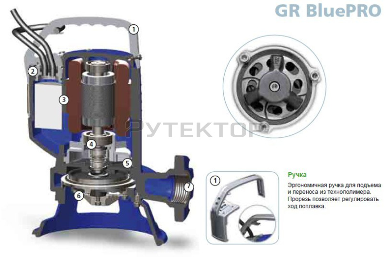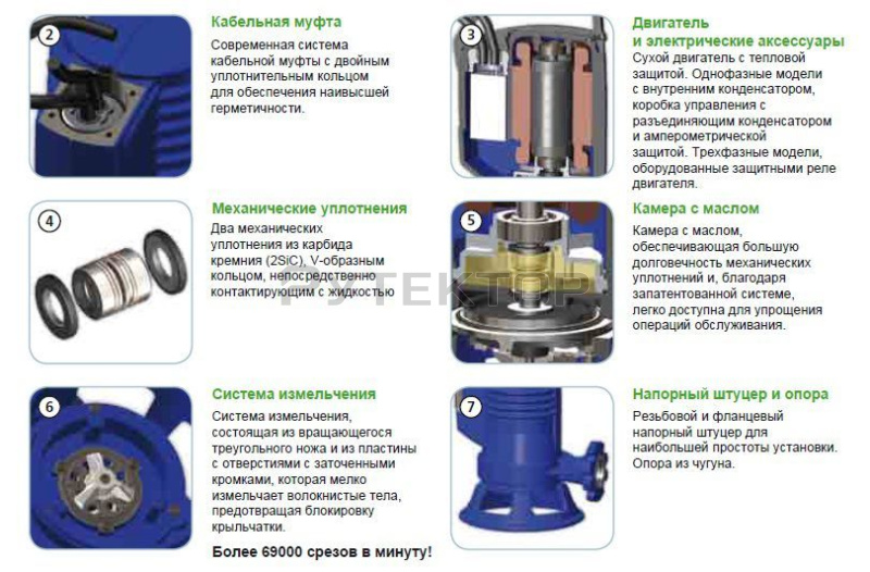 Особенности исполнения Насос предназначенный для погружной работы, укомплектованный 2 оппозитными механическими уплотнениями из карбида кремния в масляной камере, V-образным кольцом, непосредственно контактирующим с жидкостью. Экологический двигатель сухого типа. Литой гидравлический корпус с оболочкой двигателя.