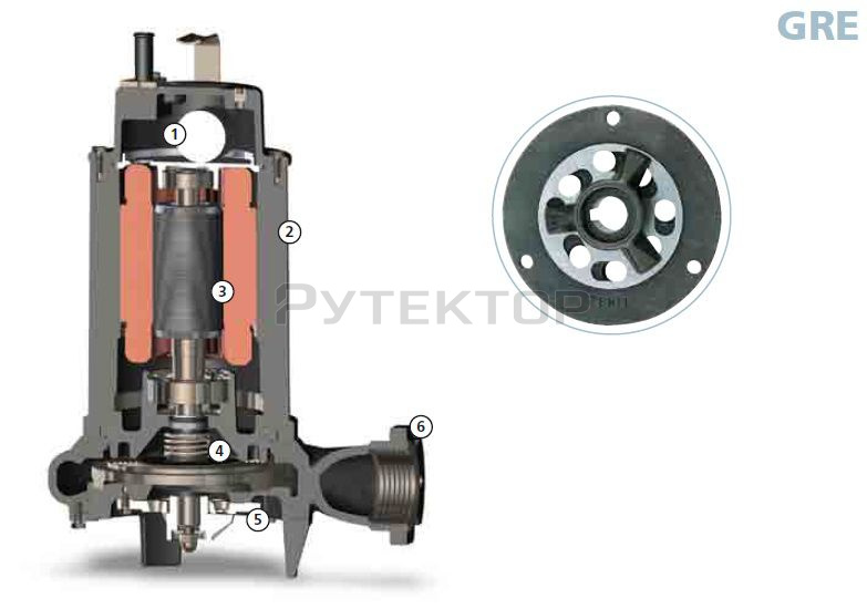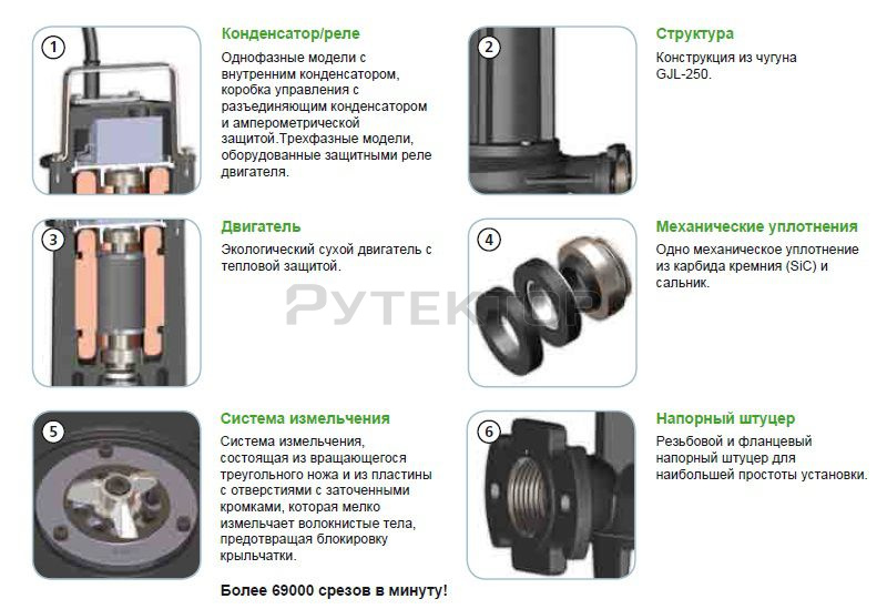 Насос предназначенный для погружной работы, Комплект уплотнений, состоящий из 1 механического уплотнения из карбида кремния и 1 сальника. Экологический двигатель сухого типа.