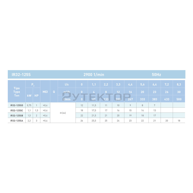 Параметры насоса с двигателем ~ 2900 об / мин.