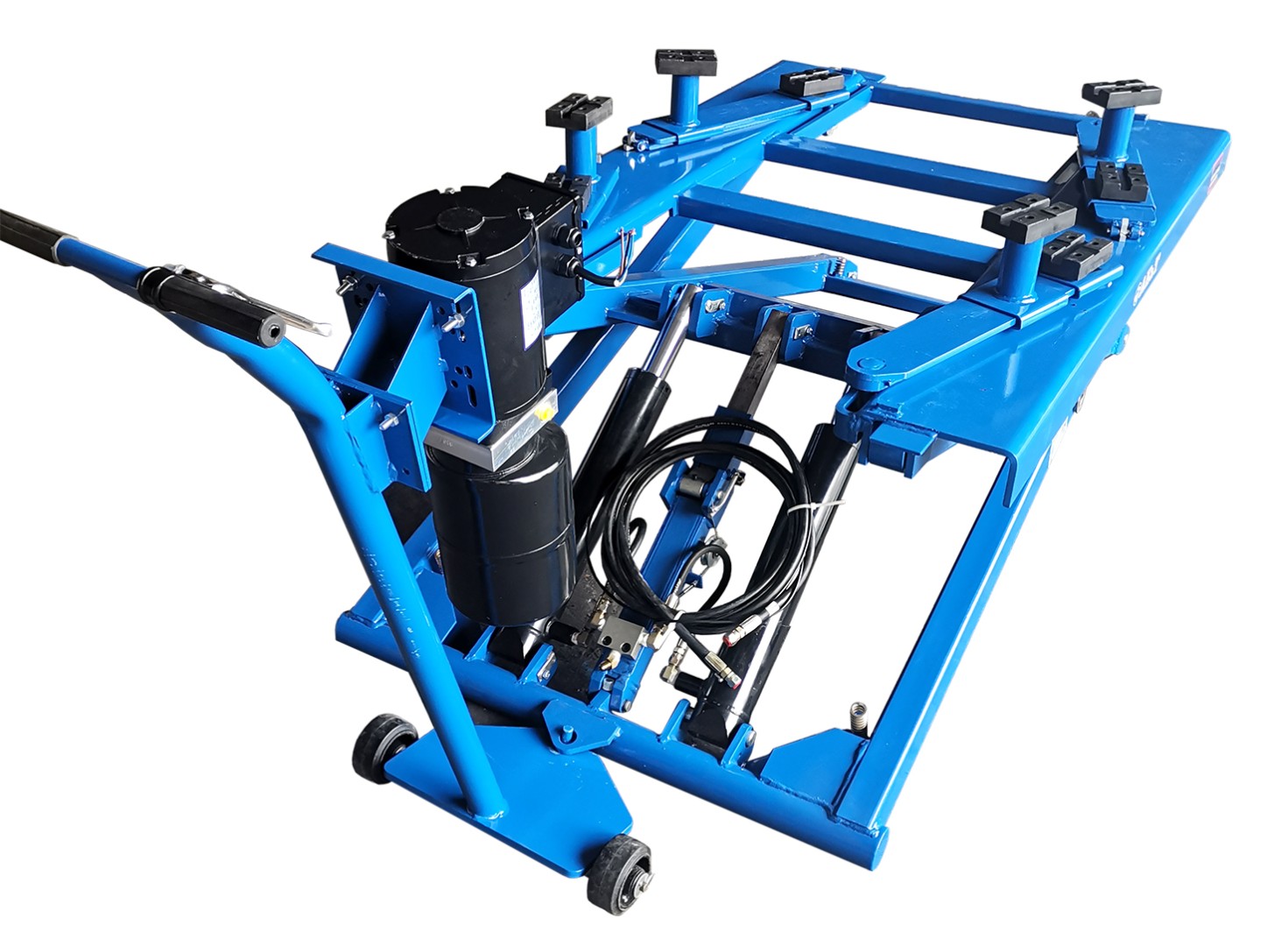 Оборудование легко перемещается при помощи специальной тележки, которая имеет крепление и колеса для зацепления и передвижения подъемника, в том числе и под неисправные автомашины. Независимая силовая станция расположена также на тележке.