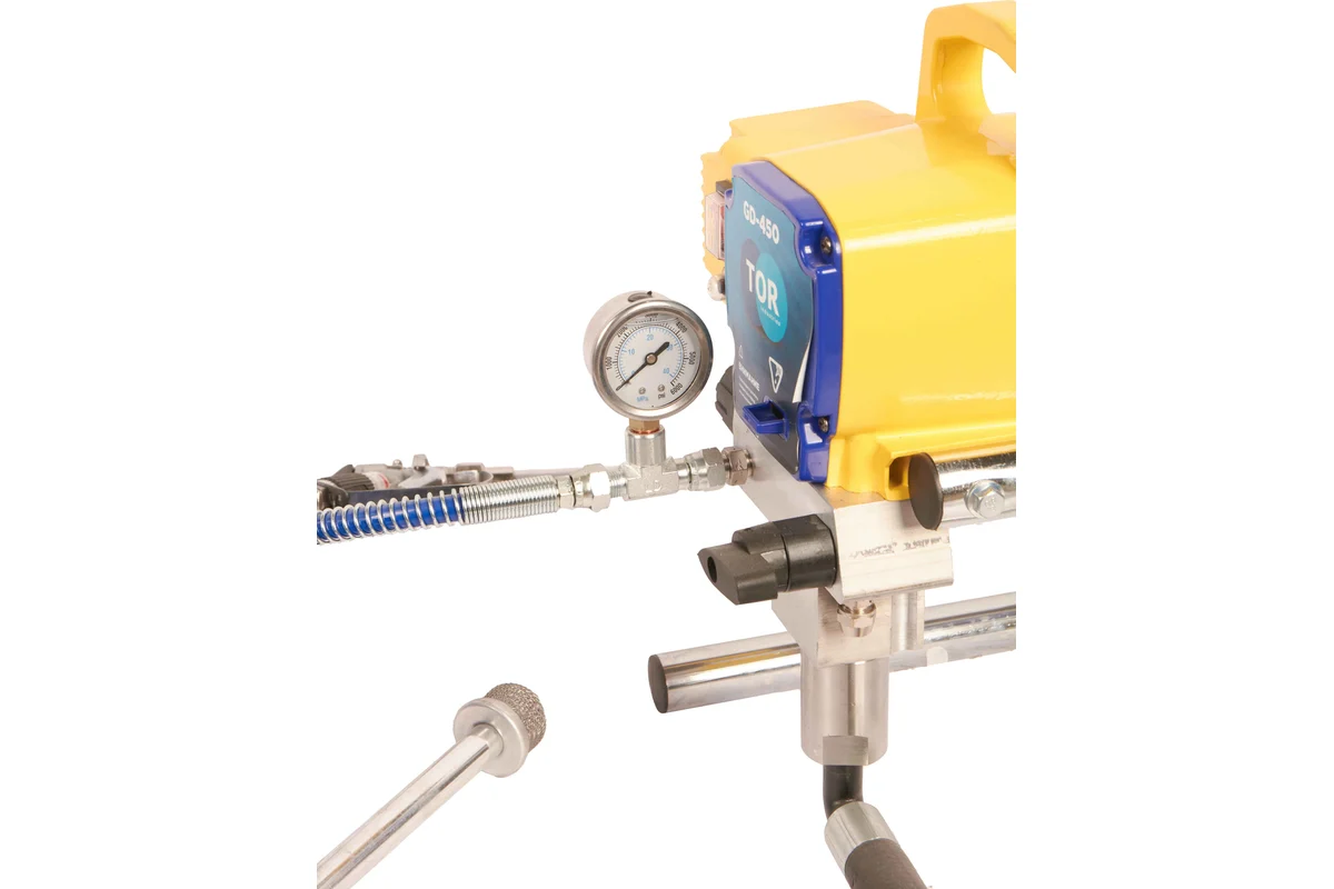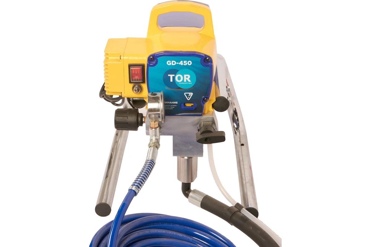 TOR GD-450 - оборудование для окраски под высоким давлением через окрасочный краскопульт безвоздушного распыления. Окрасочный агрегат безвоздушного распыления предназначен для использования на строительных площадках и промышленных предприятиях. Он применяется для распыления под большим давлением красок и других материалов вязкостью до 60 DIN. Работает аппарат от стандартной сети 220В. Производительность при давлении 12 МПа составляет 1,7 литра в минуту, максимальное рабочее давление - 20 МПа.