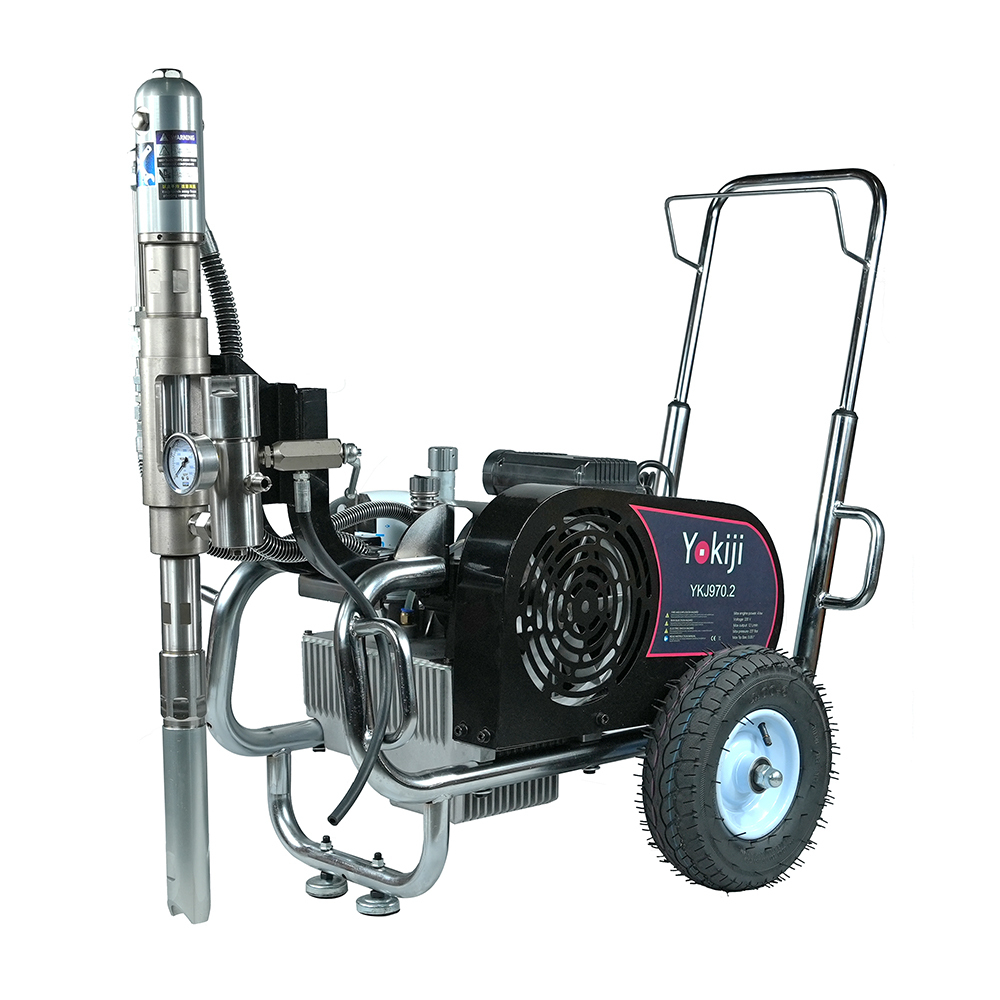 YOKIJI YKJ 970.2 – гидропоршневой безвоздушный электрический окрасочный аппарат. Он может применяться для распыления материалов с высокой, средней и низкой вязкости: красок, эмалей, шпаклевок, огнезащитных, гидроизоляционных, антикоррозийных и цинконаполненных составов, мастик, грунтовок. Аппарат используется на стройплощадка при отделке помещений, зданий и сооружений, а также на производствах при покраске больших конструкций. Модель работает от розетки 220B и обладает высокой производительностью (10 л/мин); позволяет присоединять до 3 малярных постов и подавать материал на высоту до 90 метров.