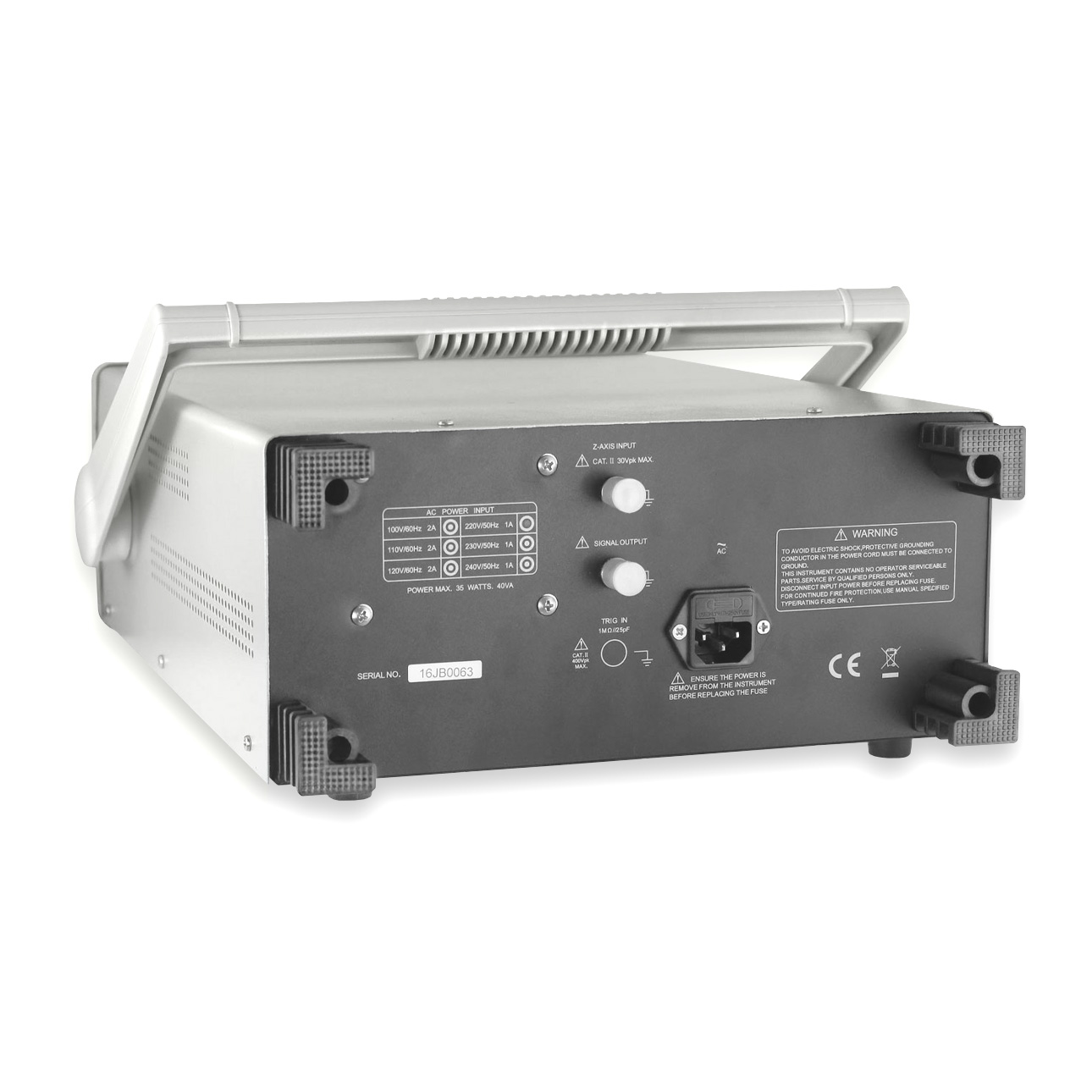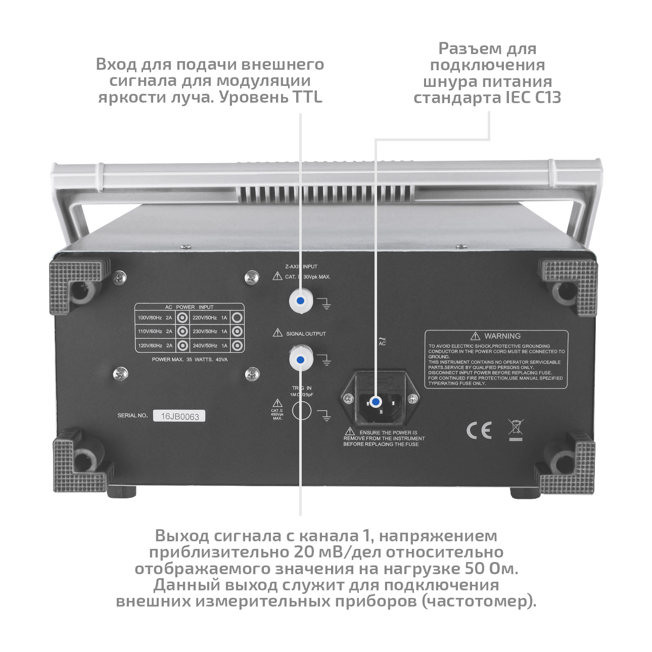 Закрытый вход: 400 В (DC + АС пик: частота не более 1 кГц); При использовании щупов с коэффициентом деления 1:1, максимальное действующее значение составляет 40В (14 В RMS для синусоидального сигнала); При использовании щупов с коэффициентом деления 10:1 максимальное значение 400В (140 В RMS для синусоидального сигнала). |