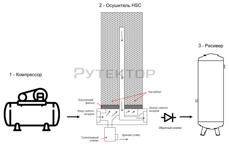 Осушители HSC предназначены для эффективного и экономичного удаления влаги, содержащейся в сжатом воздухе, и применения непосредственно после воздушного компрессора. Несмотря на малые габариты, они способны обеспечить значение точки росы -20°C…-40°C (-40°C при кратковременной работе). Регенерация происходит при естественном охлаждении осушителя окружающим воздухом – при этом происходит конденсация накопленной влаги на стенках емкости с адсорбентом и дренирование с помощью встроенного клапана.