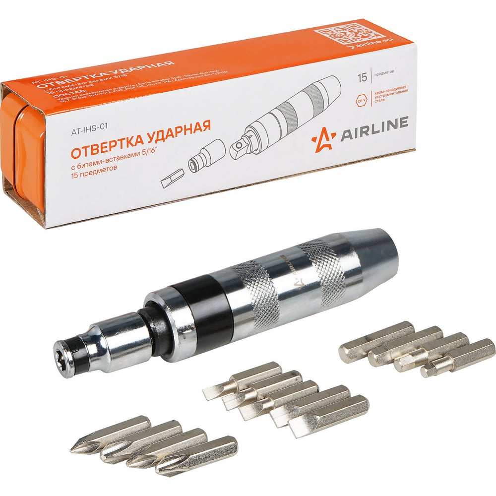 Отвёртка ударная с битами-вставками 5/16", набор 15 пр. AIRLINE AT-IHS-01 Ударная отвертка это специальный инструмент, применяемый для отвинчивания сложного крепежа с закисшей резьбой или зафиксированного резьбовым герметиком. Устройство преобразует энергию удара молотком по ее корпусу в поворотное усилие для заворачивания / отворачивания крепежа. В момент удара рабочий профиль отвёртки плотно прижимается к крепежу и создаётся большой крутящий момент. Конструкция отвёртки позволяет использовать её с торцевыми головками 1/2". Артикул: AT-IHS-01 OEM номера: 766906, 40013 Состав: металл Размер: SL5, SL6, SL7, SL8x2, PH1, PH2, PH3, PH4, H5, H6, H7, H8 Материал стержня: CRV Материал рукоятки: двухкомпонентная