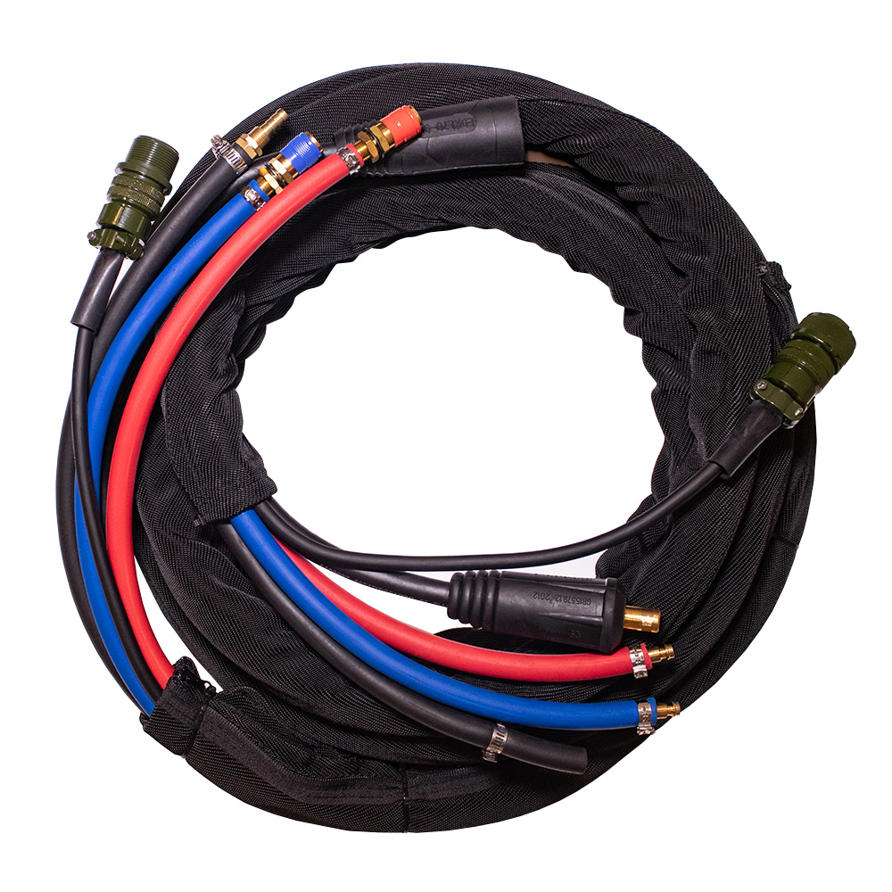 Пакет-коннектор длиной 5 метров с сечением 50 мм2 и 10-контактным разъёмом с водяным охлаждением предназначен для передачи тока до 500 А в сварочных аппаратах и промышленных генераторах, обеспечивая стабильную работу при температурах до 120°C благодаря встроенной системе охлаждения и термостойким жилам из бескислородной меди. Двойная изоляция с силиконовым покрытием и армированный шланг охлаждения гарантируют защиту от механических повреждений, перегрева и химических воздействий в условиях интенсивной эксплуатации.