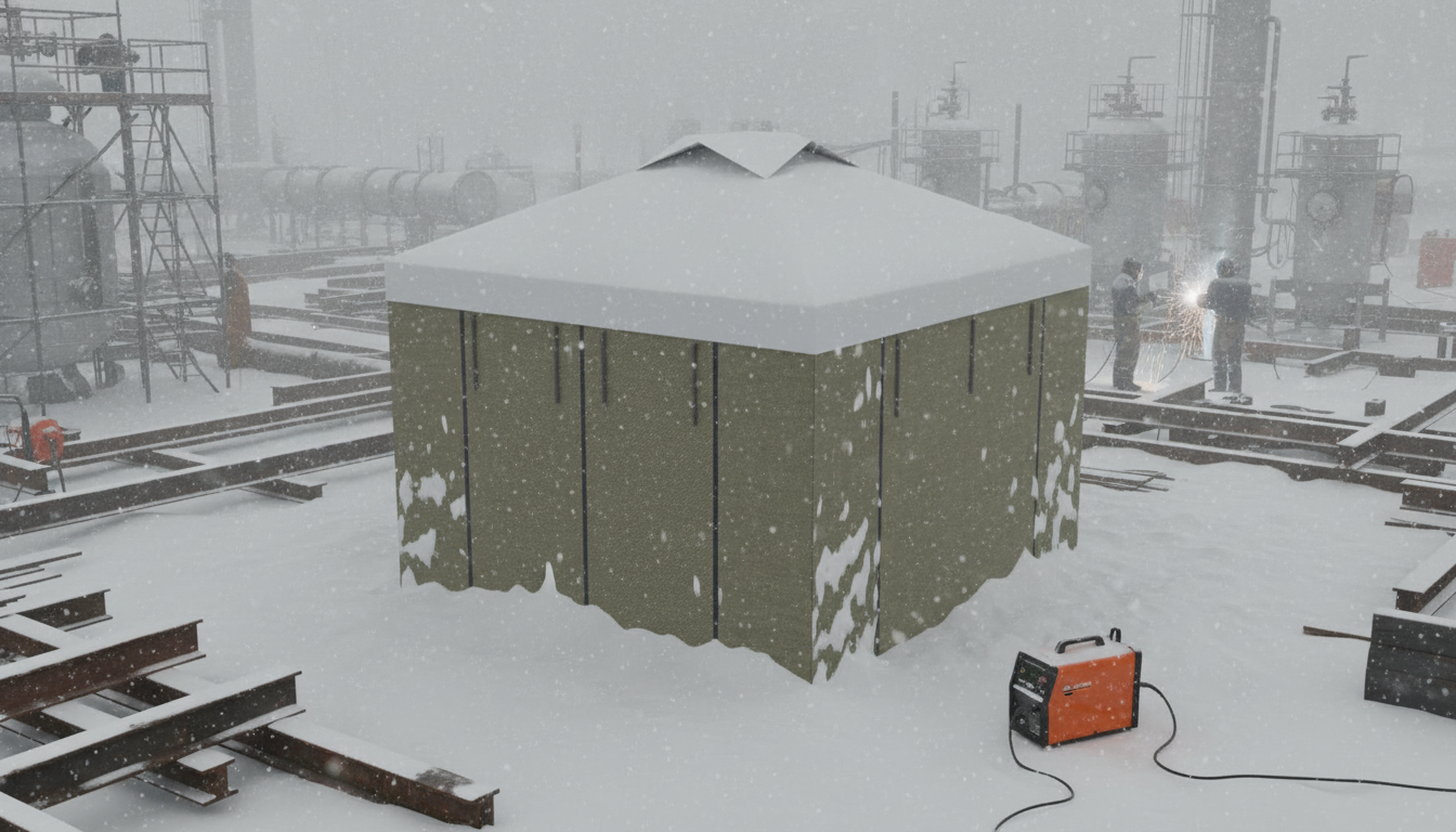 Палатка сварщика "МногоТентов" (ПС-3) 3x3 м предназначена для проведения сварочно - монтажных работ на трубопроводах различного назначения: газовые коммуникации, нефтепроводы, сети водоснабжения.Особенностью ПС-3 является патрубок для трубопровода (диаметр трубы 620 - 1520 мм). Стенки оснащены открывающимися воротами, которые фиксируются для прохождения трубы. Вход застегивается на молнию. Каркас палатки выполнен из металлического профиля, для сборки которого не требуется инструмент, время сборки занимает около 15 минут. Порошковая покраска каркаса обеспечивает образование ударопрочного антикоррозийного покрытия. Стены палатки выполнены из брезента, достоинством которого являются: воздухопроницаемость, низкая гигроскопичность, износостойкость, устойчивость к растяжениям, трению, химическим реагентам. Крыша палатки выполнена из тентовой ткани ПВХ преимуществами которой являются: высокая прочность, долговечность, водонепроницаемость и устойчивость к перепаду температур от -30°C до +70°C.Использовать сварочную палатку (домик) можно и в зимнее время года. Ткань не затвердевает при отрицательной температуре, для обогрева можно использовать тепловую пушку. Рассчитана для работы до 5 человек.