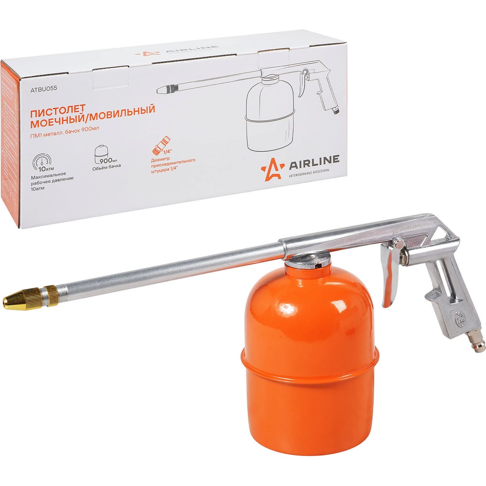 Пистолет моечный/мовильный ПМ1 металл. бачок 900мл AIRLINE ATBU055 изготовлен из металла. Имеет съёмный бачок для распыляемого состава. Прочный металлический корпус устойчив к повреждениям