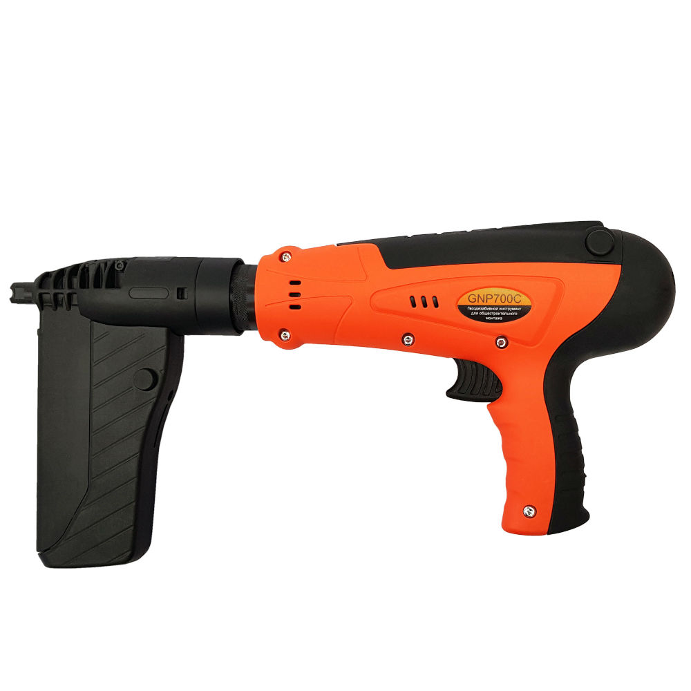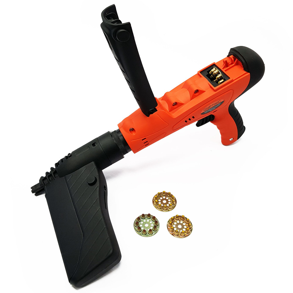 Пистолет монтажный пороховой GNP700C - сверхпроизводительный и надежный пистолет для общих строительных работ в любой материал. Используемые патроны: F-DK (6,3х10 мм) в диске по 10 шт. Дюбели в кассете GNPC8 диаметром 3.7мм, длиной 16-60мм. Масса - 3.25кг. Области применения: крепление опалубочной фанеры к бетону, крепление подвесов спец. крепежом или монтажной лентой, крепление профнастила к металлическим балкам, крепление сетки к бетону и кирпичу, крепление стальных полос и пластин к бетону и кирпичу, монтаж гипсокартона, монтаж изоляционных материалов на фасаде и к потолку, монтаж теплых полов при помощи текстильной или стальной ленты, монтаж тонких изоляционных материалов к бетону и кирпичу.