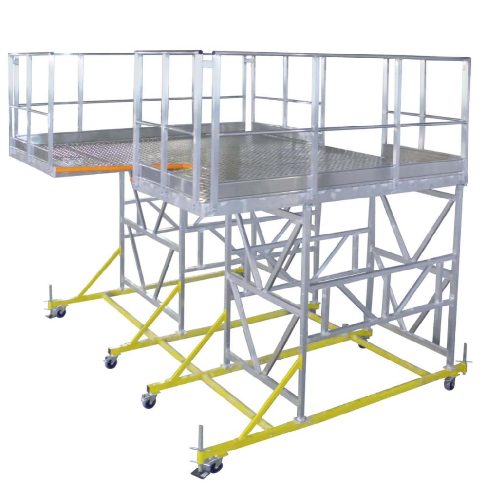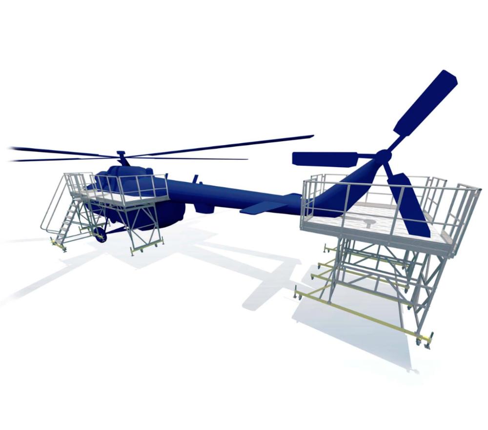 Платформа задняя для обслуживания вертолета MEGAL (Хвостовая стремянка) предназначена для обслуживания вертолета при проведении работ в хвостовой части. Конструкция имеет легкий вес за счет использования алюминиевых сплавов. Со стороны обслуживания предусмотрен силиконовый отбойник. Настил площадки, выполненный из рифленого листа "квинтет" гарантирует безопасную работу. Основание платформы оборудовано винтовыми опорами и колёсами _125 мм с фиксаторами. Высокая грузоподъемность обеспечивается за счет использования труб и профилей со стенкой не менее 2,5мм.