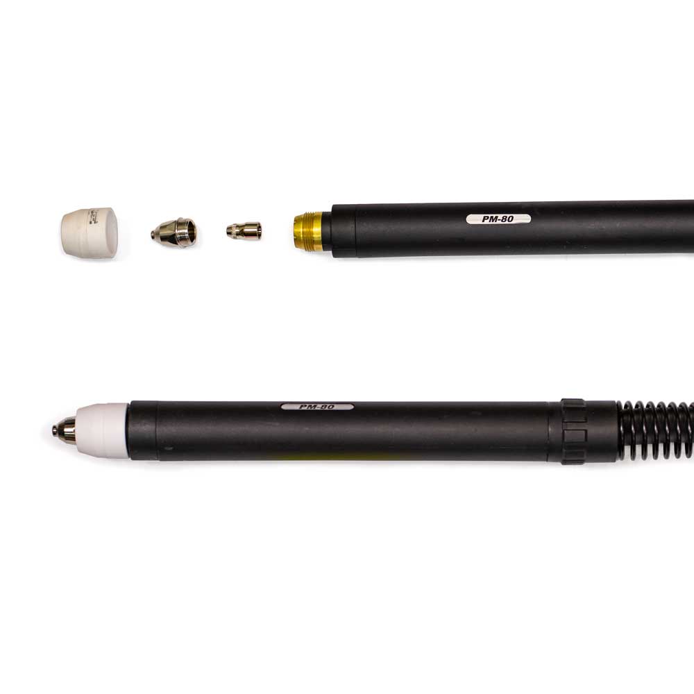 Машинный плазменный резак PP80 с подключением М16х1,5 и 5-метровым кабелем обеспечивает точную резку металла толщиной до 25 мм при токе 80 А благодаря высокочастотному HF-поджигу, мгновенно запускающему дугу без контакта с заготовкой даже в запыленных условиях промышленных цехов. Усиленная конструкция с медным электродом и керамическим соплом выдерживает 10 000+ циклов работы при температурах до 180°C, а воздушное охлаждение гарантирует стабильность при трёхсменной эксплуатации на автоматических линиях.