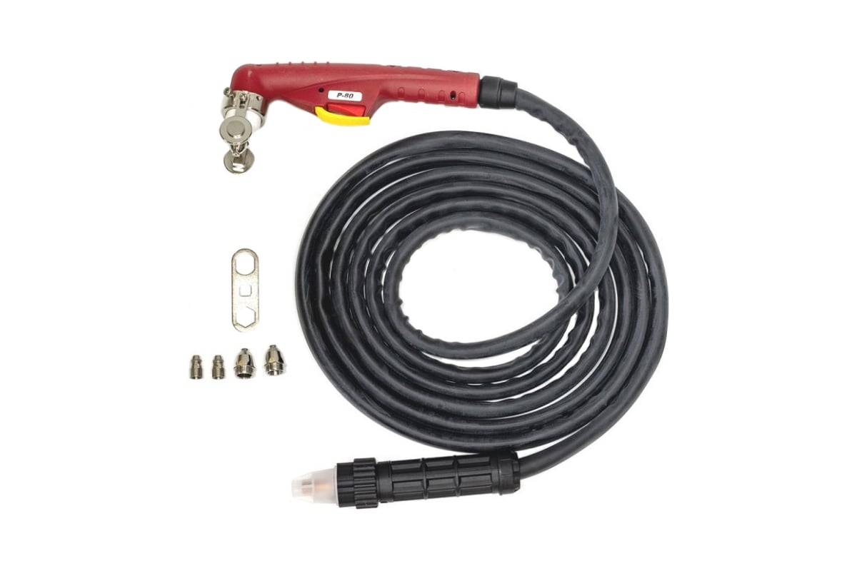 Кабель длиной 5 метров позволяет выполнять работы на больших площадях без перемещения плазмореза. Конструкция резака предусматривает кнопочное управление.