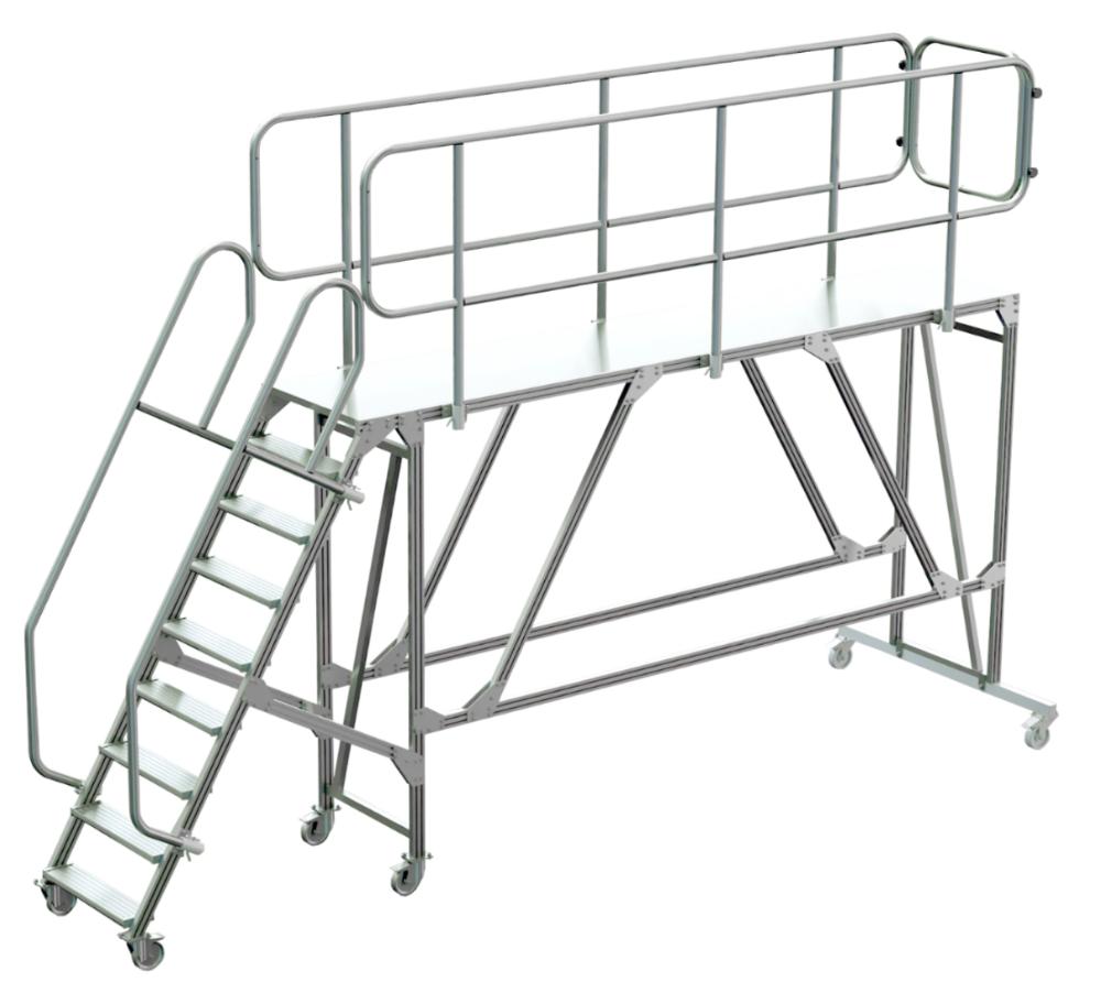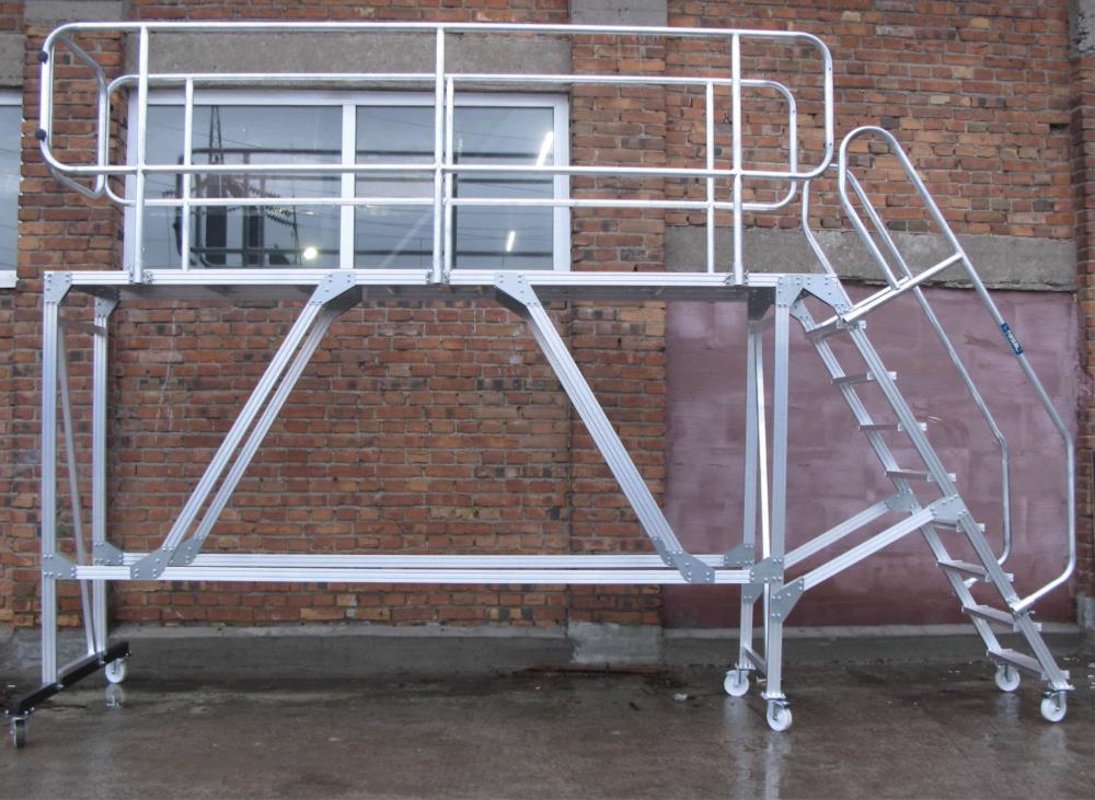 Площадка авиационная алюминиевая MEGAL ПАА - 2,1 х 3,5 изготовлена из рифленого листового алюминия. Площадка имеет трёхстороннее ограждение и оборудована калиткой, для обеспечения сквозного прохода. Рабочая площадка и лестница оборудованы быстросъемными, усиленными перилами-ограждениями площадки и лестничного марша. Перила по всей длине лестничного марша для безопасного подъема и спуска.
