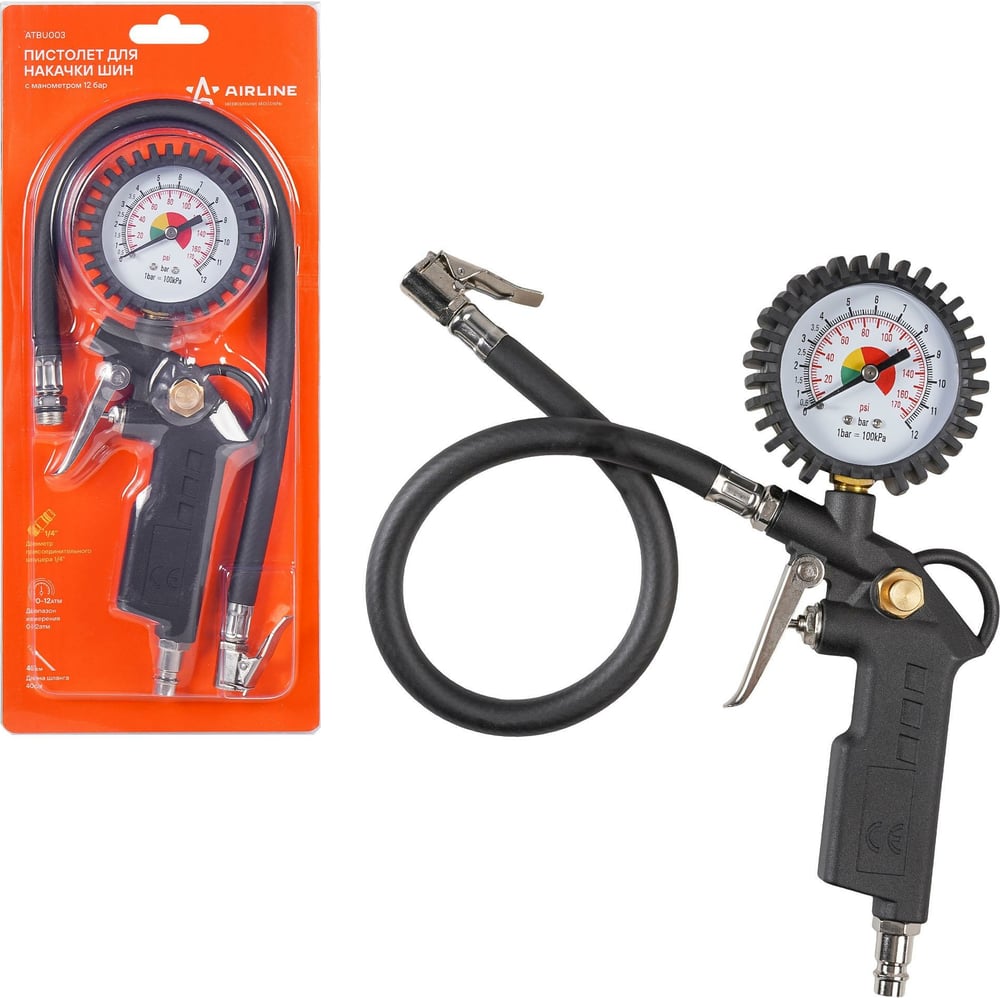 Пистолет для накачки шин с манометром Airline 12BAR ATBU003 изготовлен из алюминиевого сплава. Манометр защищён резиновым чехлом. Гибкий шланг имеет быстросъёмный наконечник. Конструкцией предусмотрена кнопка для сброса лишнего давления. Диапазон измеряемого давления: 0-12 bar, 0-172 psi.
