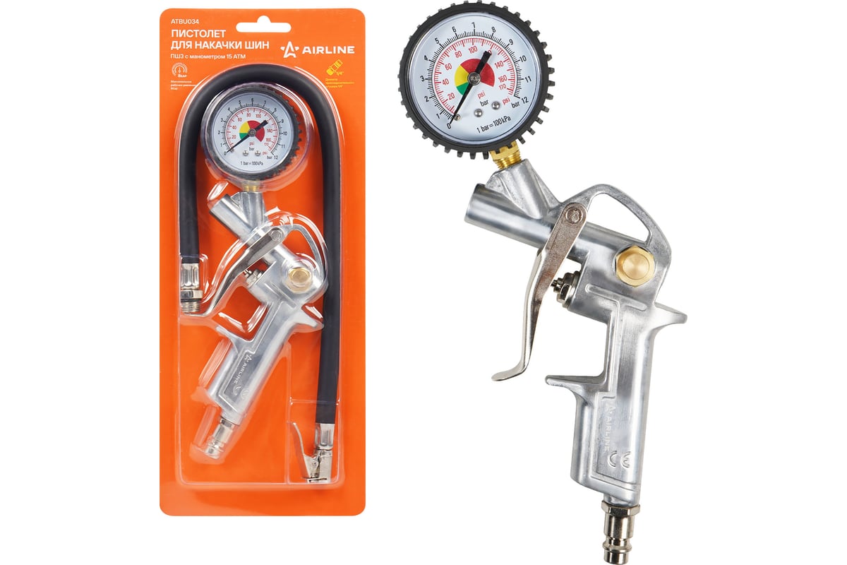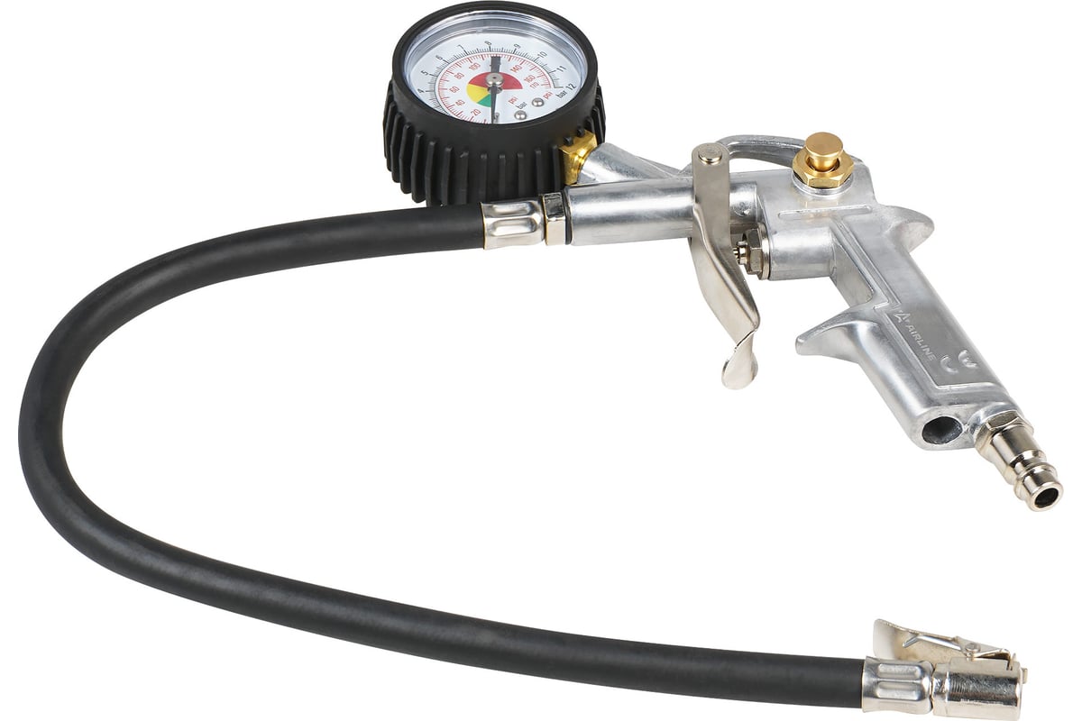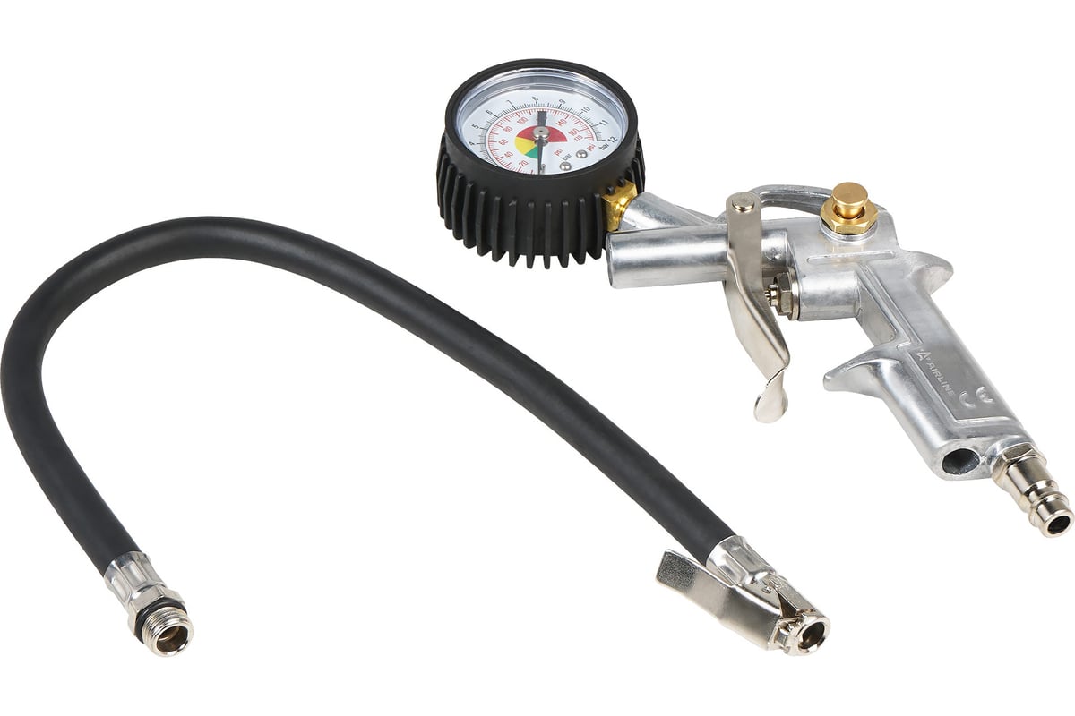 К орпус пистолета изготовлен из алюминиевого сплава. Манометр защищён резиновым чехлом. Гибкий шланг имеет быстросъёмный наконечник. Конструкцией предусмотрена кнопка для сброса лишнего давления. В комплект входит присоединительный фитинг 1/4".