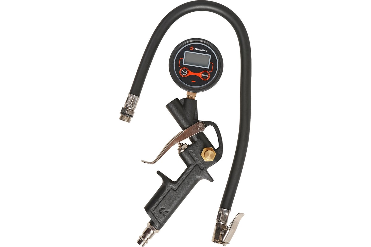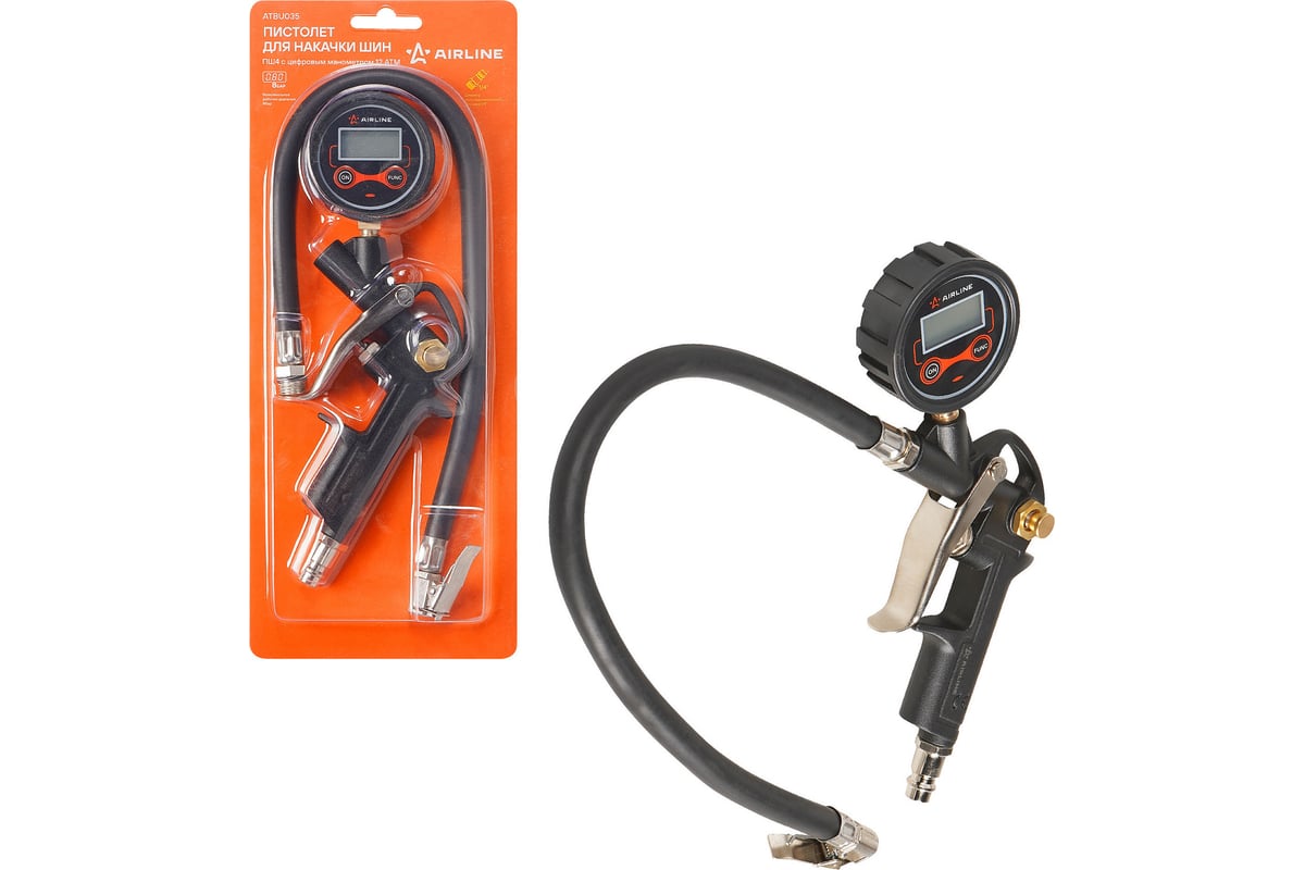Пистолет для накачки шин ПШ4 с цифровым манометром 12 АТМ AIRLINE ATBU035 Корпус пистолета изготовлен из алюминиевого сплава. Манометр защищён резиновым чехлом. Гибкий шланг имеет быстросъёмный наконечник. Конструкцией предусмотрена кнопка для сброса лишнего давления. В комплект входит присоединительный фитинг 1/4.