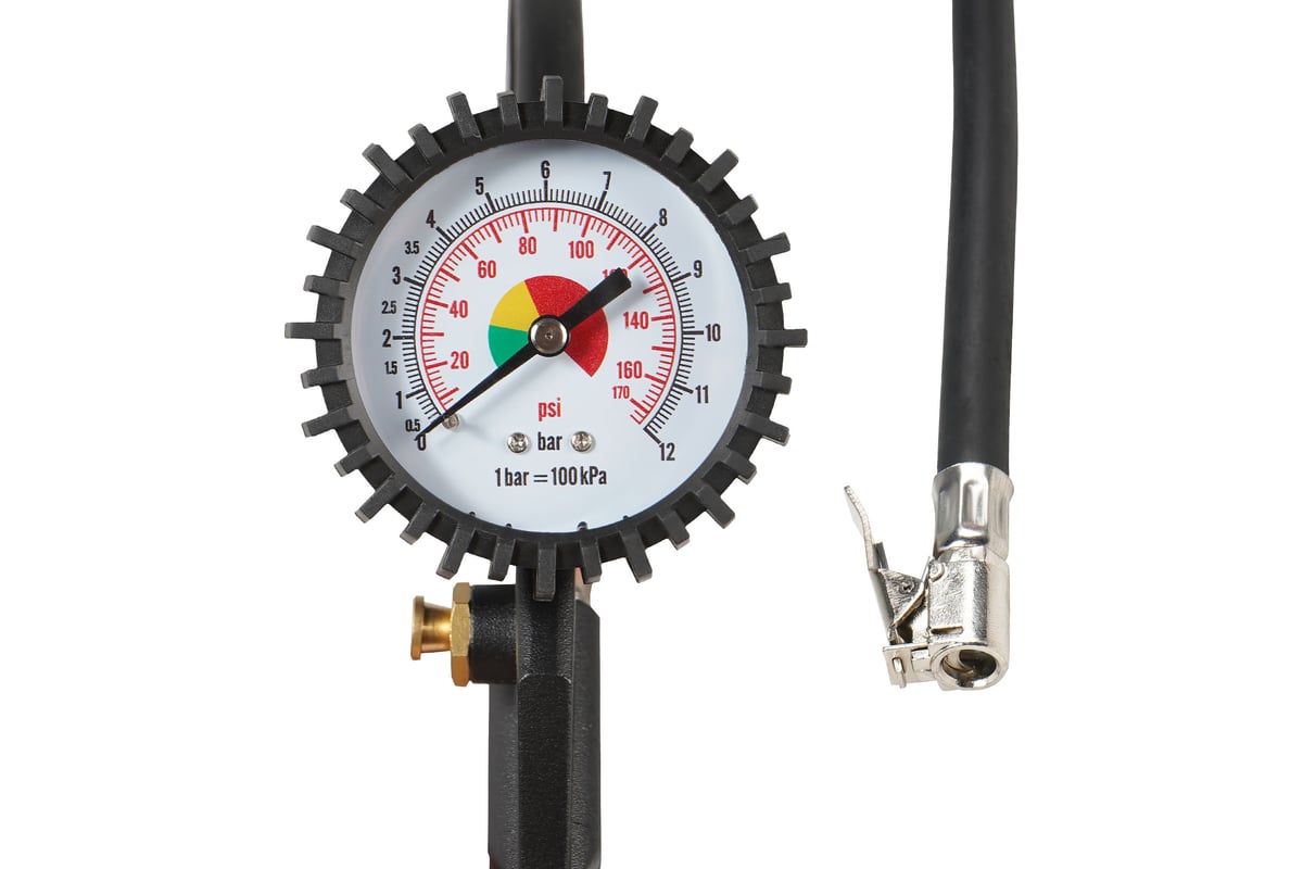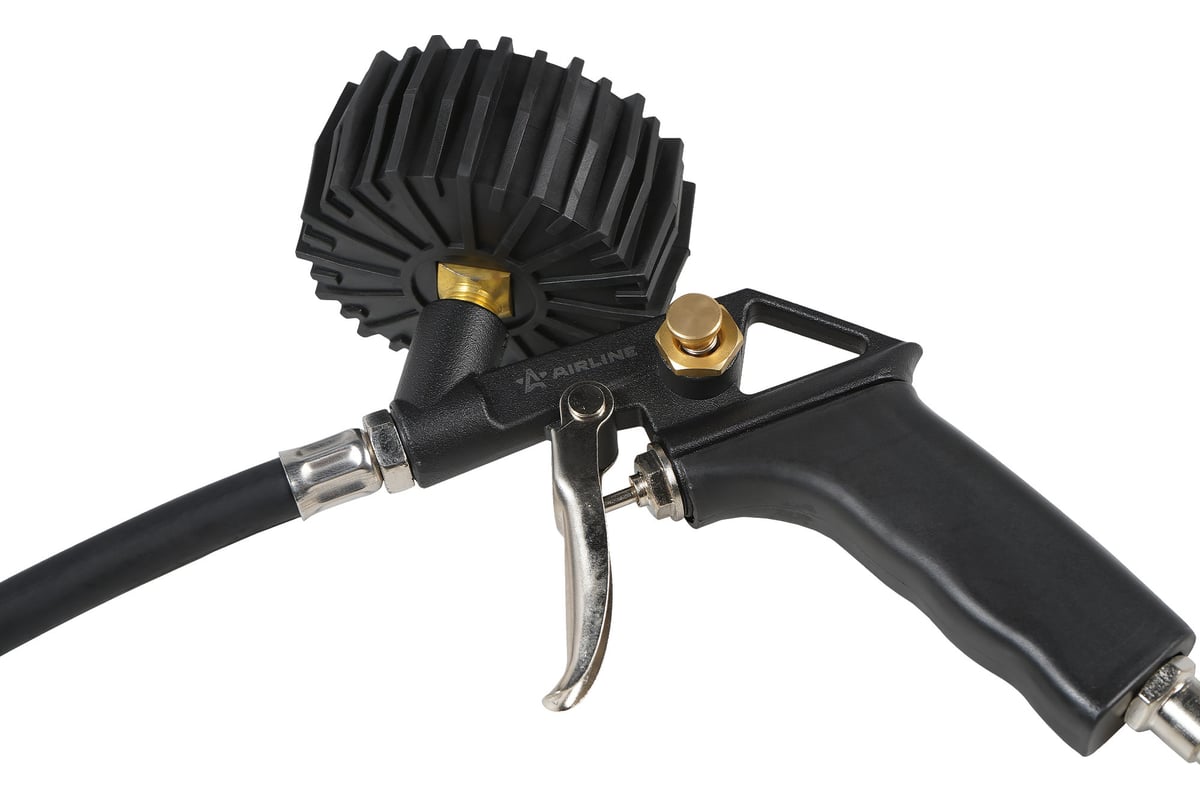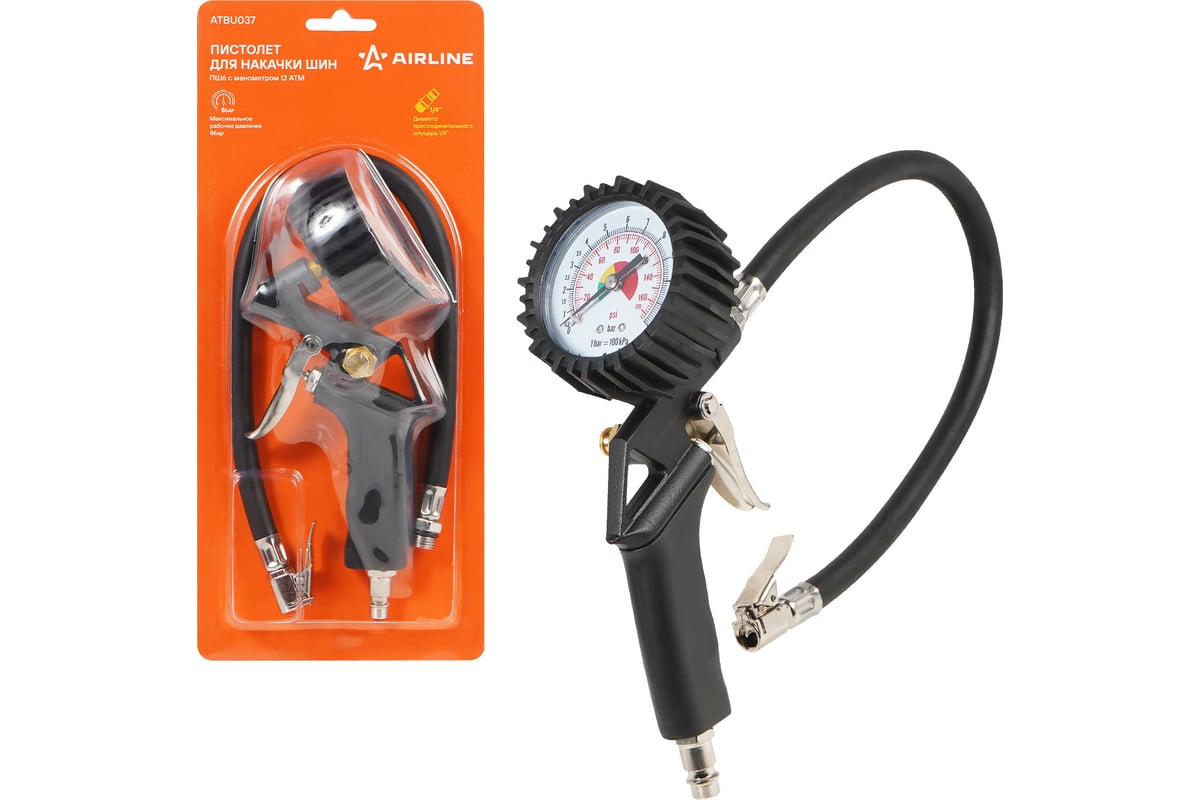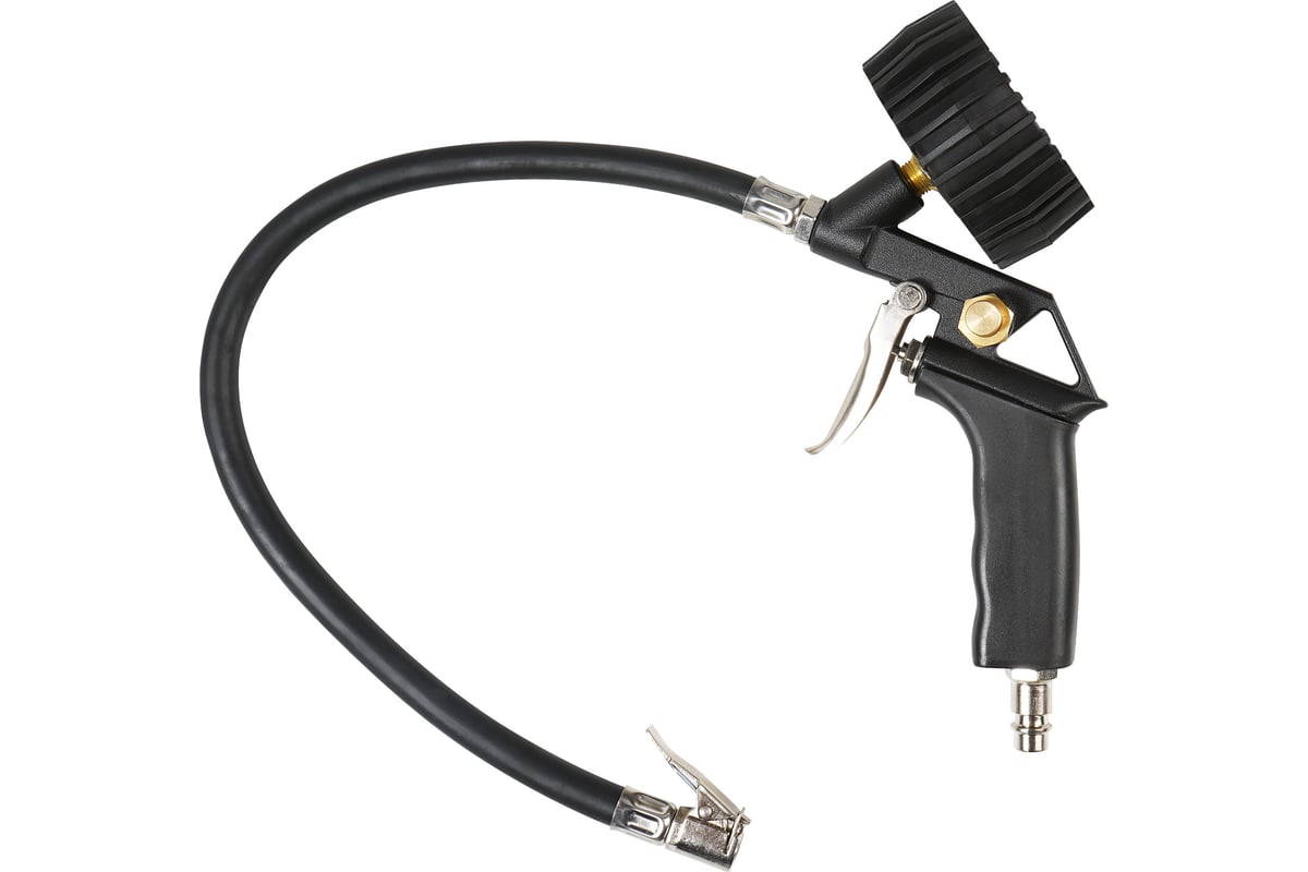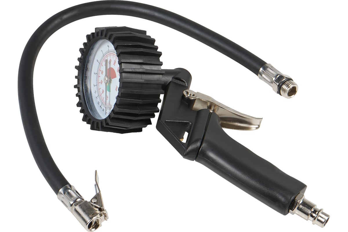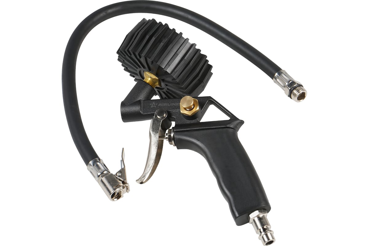 Корпус пистолета изготовлен из алюминиевого сплава. Манометр защищён резиновым чехлом. Гибкий шланг имеет быстросъёмный наконечник. Конструкцией предусмотрена кнопка для сброса лишнего давления. В комплект входит присоединительный фитинг 1/4".