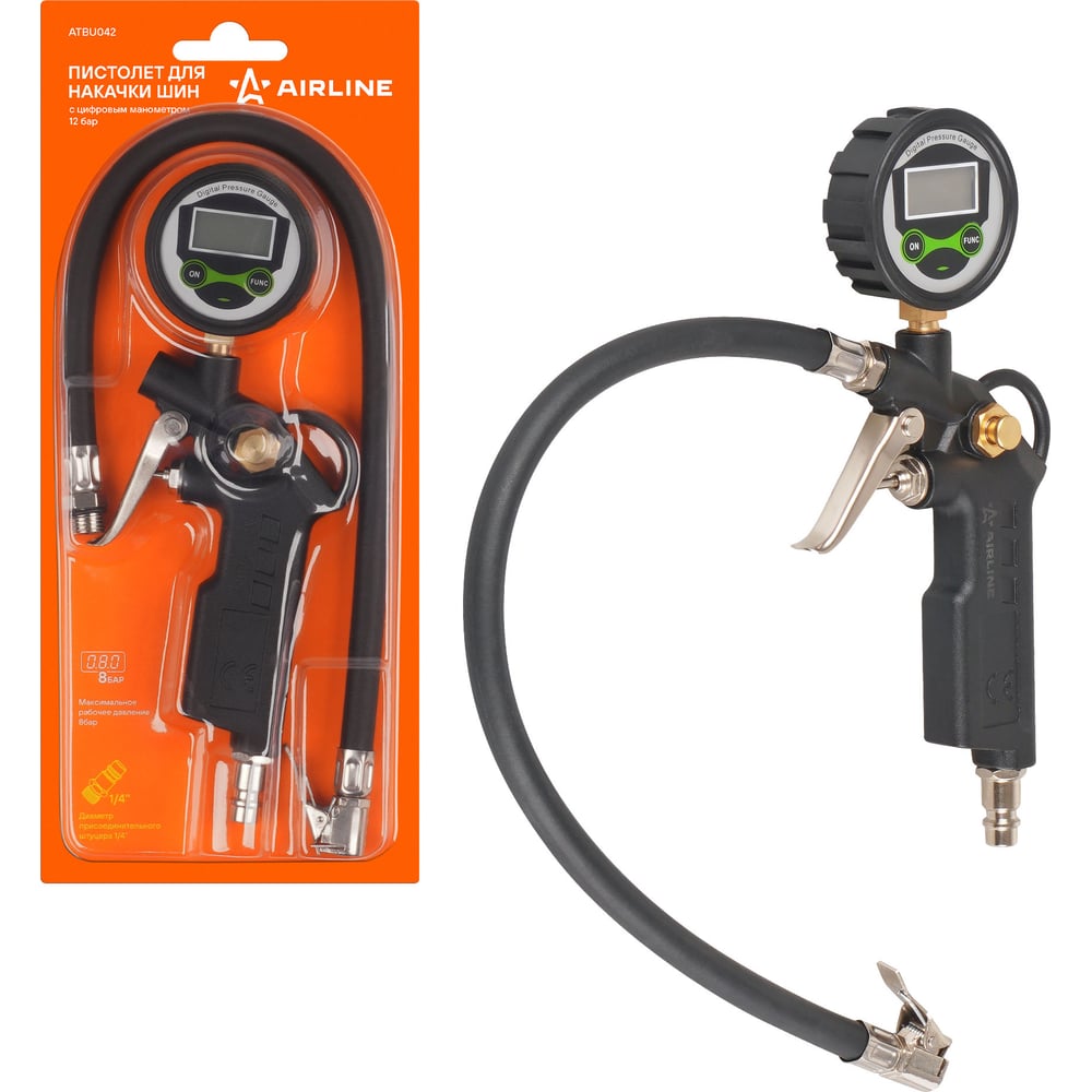 Пистолет для накачки шин с цифровым манометром 12 АТМ AIRLINE ATBU042, корпус которого изготовлен из алюминиевого сплава. Манометр защищён резиновым чехлом. Гибкий шланг имеет быстросъёмный наконечник. Конструкцией предусмотрена кнопка для сброса лишнего давления. В комплект входит присоединительный фитинг 1/4". Состав: металл/пластик Максимальное рабочее давление: 8 ATM Диаметр присоединительного штуцера: 1/4" Длина шланга, мм: 440