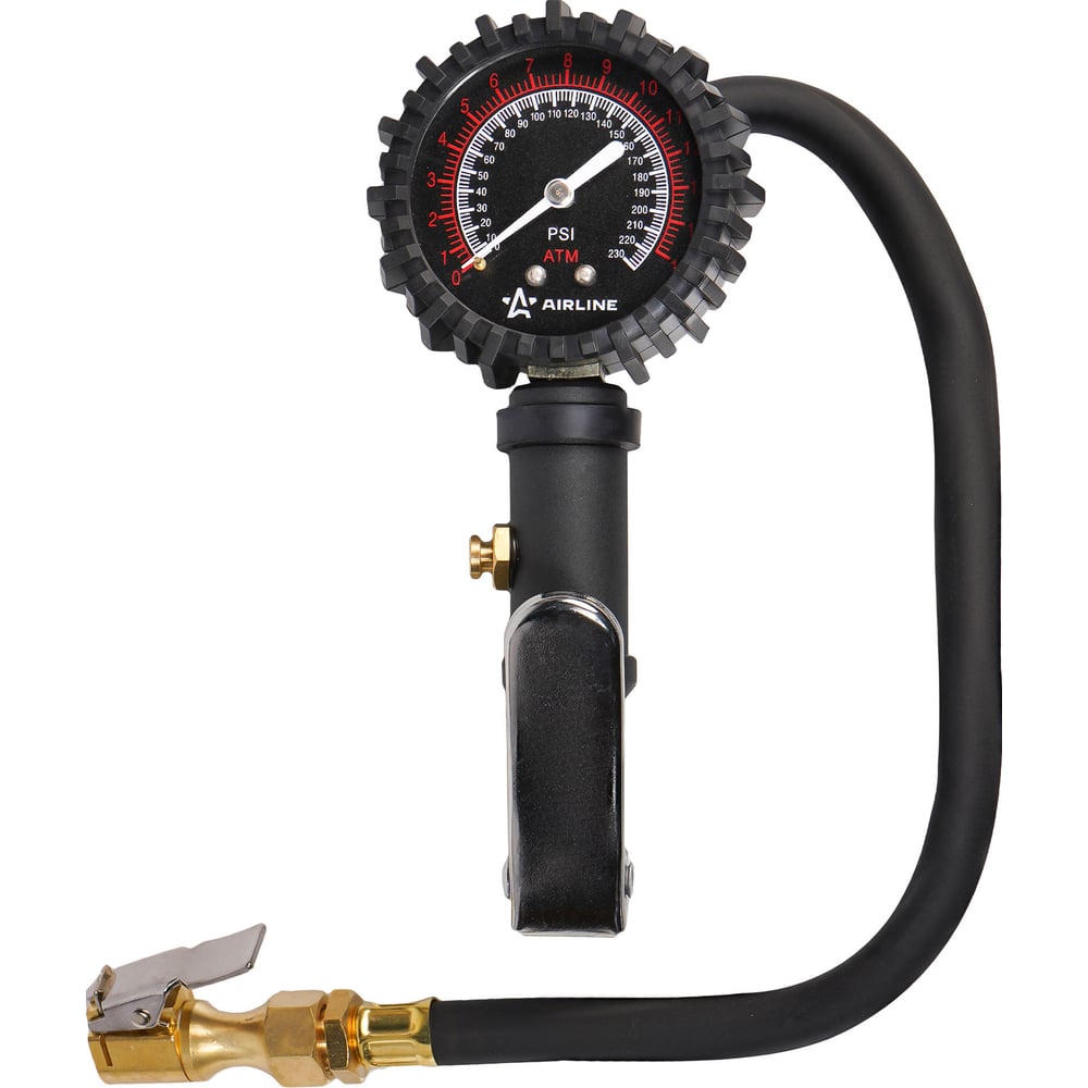 Пистолет для накачки шин с манометром Airline PRO 16АТМ, с клапаном сброса ATBU007 изготовлен из алюминиевого сплава. Манометр защищён резиновым чехлом. Гибкий шланг имеет быстросъёмный наконечник. Конструкцией предусмотрена кнопка для сброса лишнего давления. Диапазон измеряемого давления: 0-16 atm, 0-230 psi.