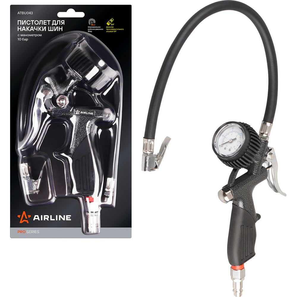 Пистолет для накачки шин с манометром 10 АТМ PRO AIRLINE ATBU043 изготовлен из алюминиевого сплава. Манометр защищён резиновым чехлом. Гибкий шланг имеет быстросъёмный наконечник. Конструкцией предусмотрена кнопка для сброса лишнего давления. В комплект входит присоединительный фитинг 1/4".