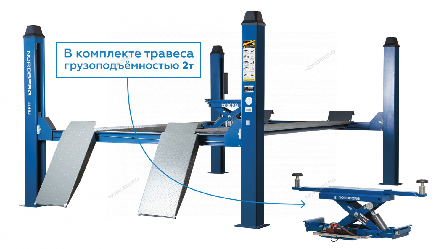 Подъемник 4-стоечный 4.5 т, c ручной траверсой 2 т N423, 380 В, синий NORDBERG 4445J_MB(M), идеальное решение для ремонта легковых авто, внедорожников, минивэнов и легких грузовиков