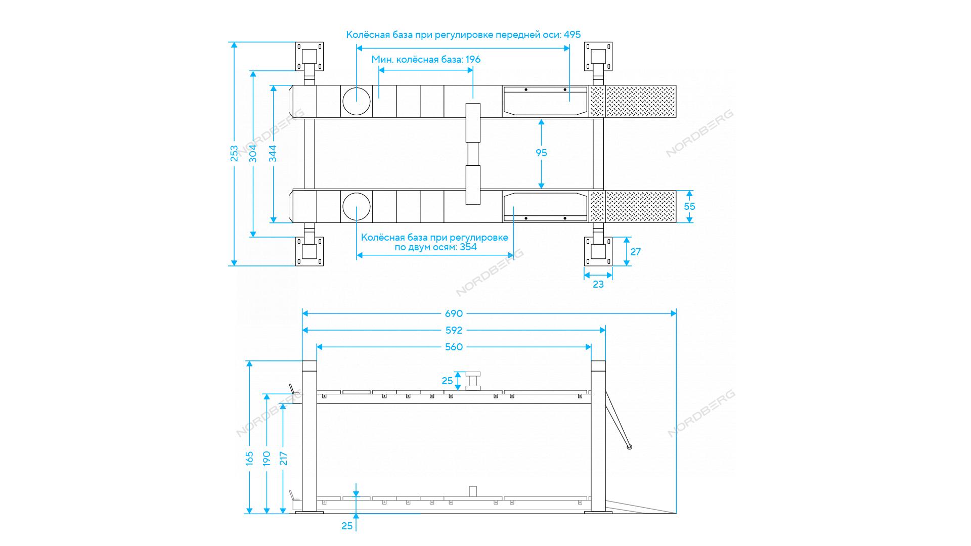 NORDBERG 4455JAB — четырёхстоечный подъемник грузоподъёмностью 5,5 т для сход-развала с пневмогидравлической траверсой.