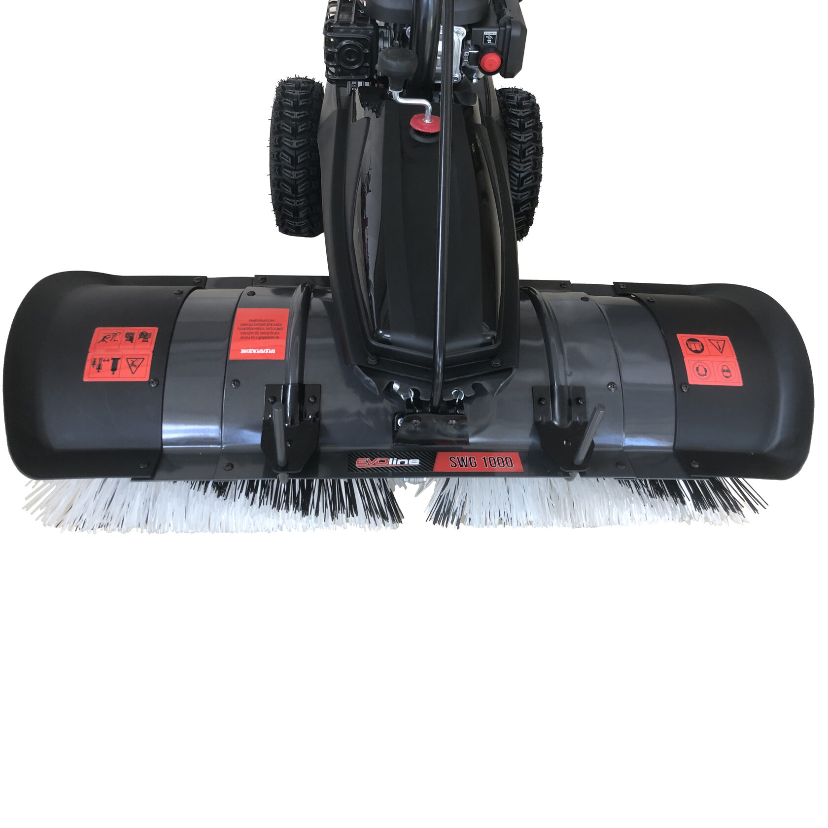 Максимальную производительность обеспечивает бензиновый двигатель Zongshen мощностью 6,5 л.с., который запускается с помощью ручного стартера. Щетки устанавливаются на подметальную машину EVOline SWG 1000 очень быстро без применения дополнительных инструментов, рабочая ширина составляет 100 см. Крупные колеса с протекторным рисунком способствуют легкому продвижению машины по разным типам местности.