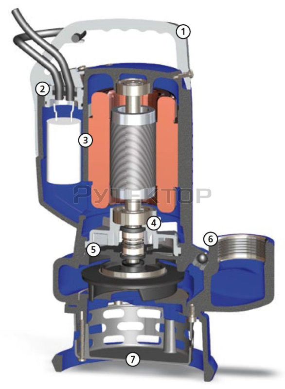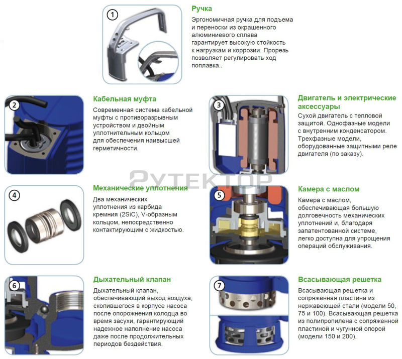 Насосные агрегаты типа DR Blue PRO - погружные с открытым многоканальным рабочим колесом и вертикальным подающим патрубком. Проточная часть насоса и рабочее колесо выполнены из чугуна. Два оппозитные механические уплотнения из карбида кремния в масляной камере. Электродвигатель сухого типа. Назначение: для чистой и слегка загрязненной воды с взвешенными частицами с диаметром до 15 мм температурой не более 40° С; предназначен для бытового и профессионального применения.
