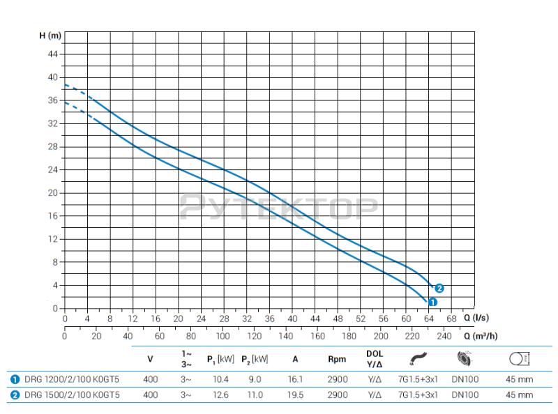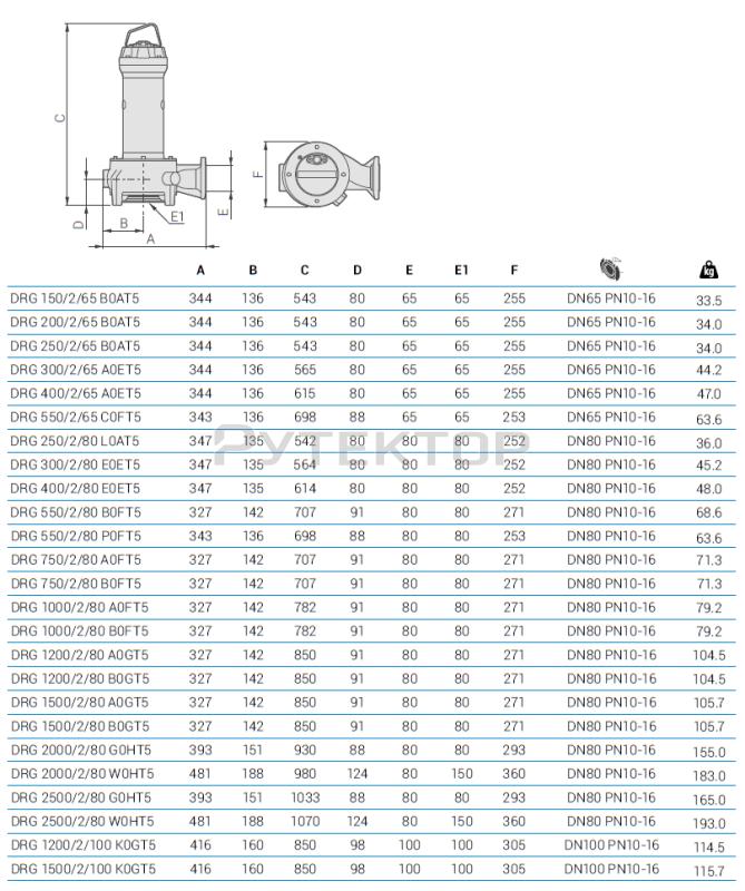 Насосные агрегаты типа DRG - погружные с открытым многоканальным рабочим колесом и горизонтальным подающим патрубком. Проточная часть насоса и рабочее колесо выполнены из чугуна. Два оппозитные механические уплотнения из карбида кремния в осматриваемой масляной камере. Электродвигатель сухого типа. Назначение: для загрязненных вод температурой не более 40° С, содержащих твердые взвешенные частицы, активный шлам с низкой или средней плотностью; предназначен для промышленного применения.