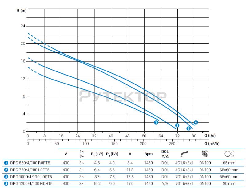 Насосные агрегаты типа DRG - погружные с открытым многоканальным рабочим колесом и горизонтальным подающим патрубком. Проточная часть насоса и рабочее колесо выполнены из чугуна. Два оппозитные механические уплотнения из карбида кремния в осматриваемой масляной камере. Электродвигатель сухого типа. Назначение: для загрязненных вод температурой не более 40° С, содержащих твердые взвешенные частицы, активный шлам с низкой или средней плотностью; предназначен для промышленного применения.