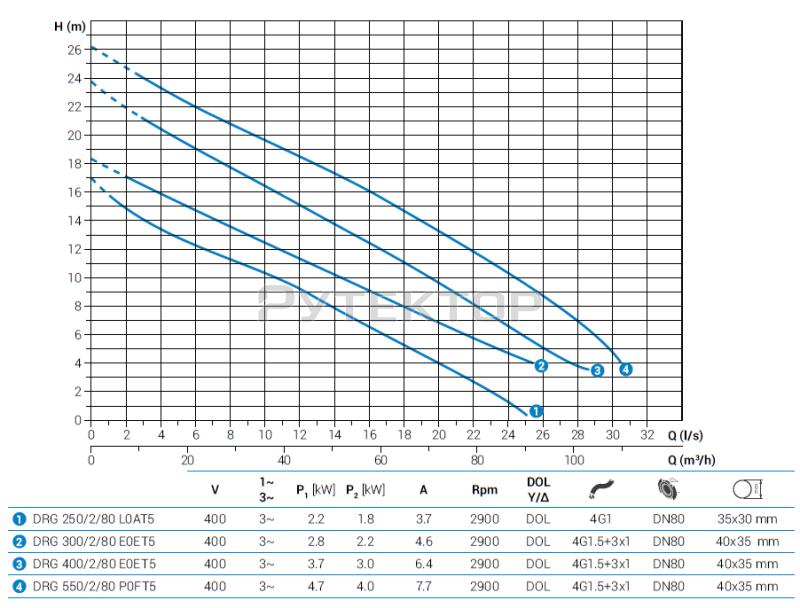 Насосные агрегаты типа DRG - погружные с открытым многоканальным рабочим колесом и горизонтальным подающим патрубком. Проточная часть насоса и рабочее колесо выполнены из чугуна. Два оппозитные механические уплотнения из карбида кремния в осматриваемой масляной камере. Электродвигатель сухого типа. Назначение: для загрязненных вод температурой не более 40° С, содержащих твердые взвешенные частицы, активный шлам с низкой или средней плотностью; предназначен для промышленного применения.