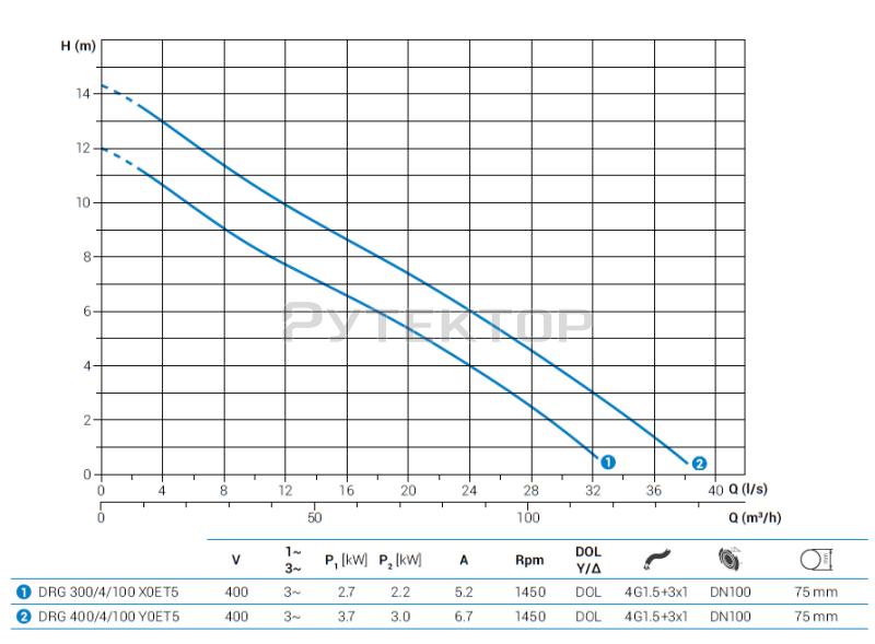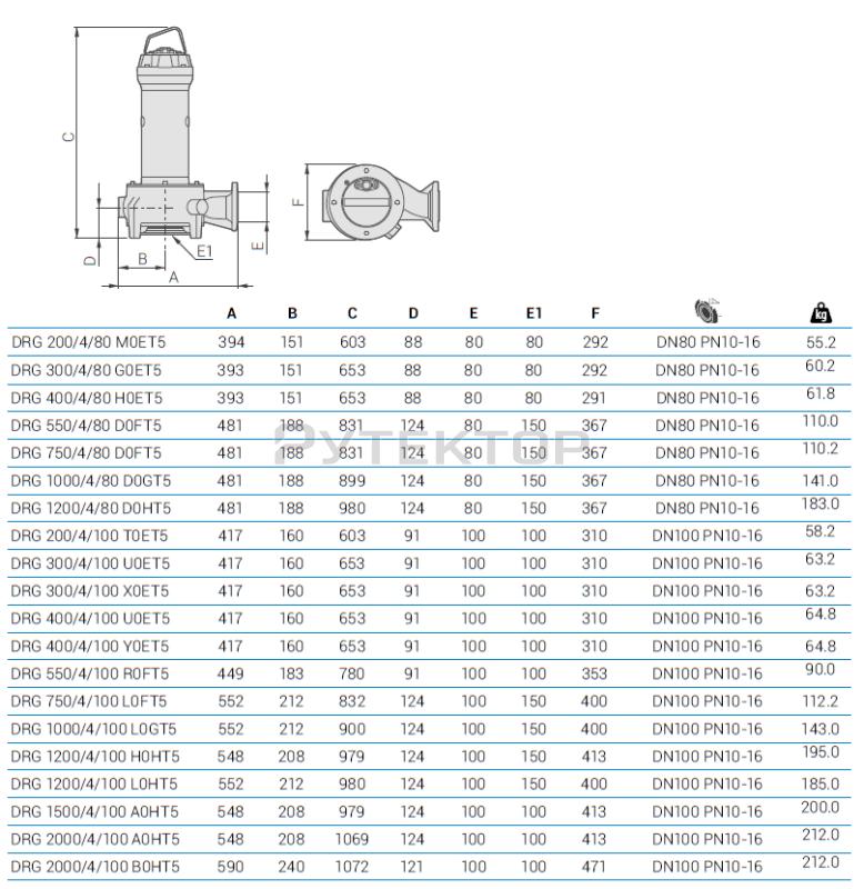 Насосные агрегаты типа DRG - погружные с открытым многоканальным рабочим колесом и горизонтальным подающим патрубком. Проточная часть насоса и рабочее колесо выполнены из чугуна. Два оппозитные механические уплотнения из карбида кремния в осматриваемой масляной камере. Электродвигатель сухого типа. Назначение: для загрязненных вод температурой не более 40° С, содержащих твердые взвешенные частицы, активный шлам с низкой или средней плотностью; предназначен для промышленного применения.