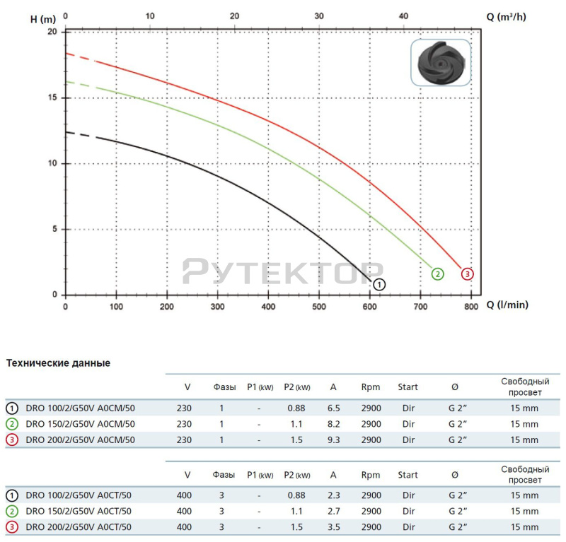 Насосные агрегаты типа DRO - погружные с открытым многоканальным рабочим колесом и вертикальным подающим патрубком. Проточная часть насоса и рабочее колесо выполнены из чугуна. Два оппозитные механические уплотнения из карбида кремния и граффито-глиноземной смеси в масляной камере. Электродвигатель в масляной камере.