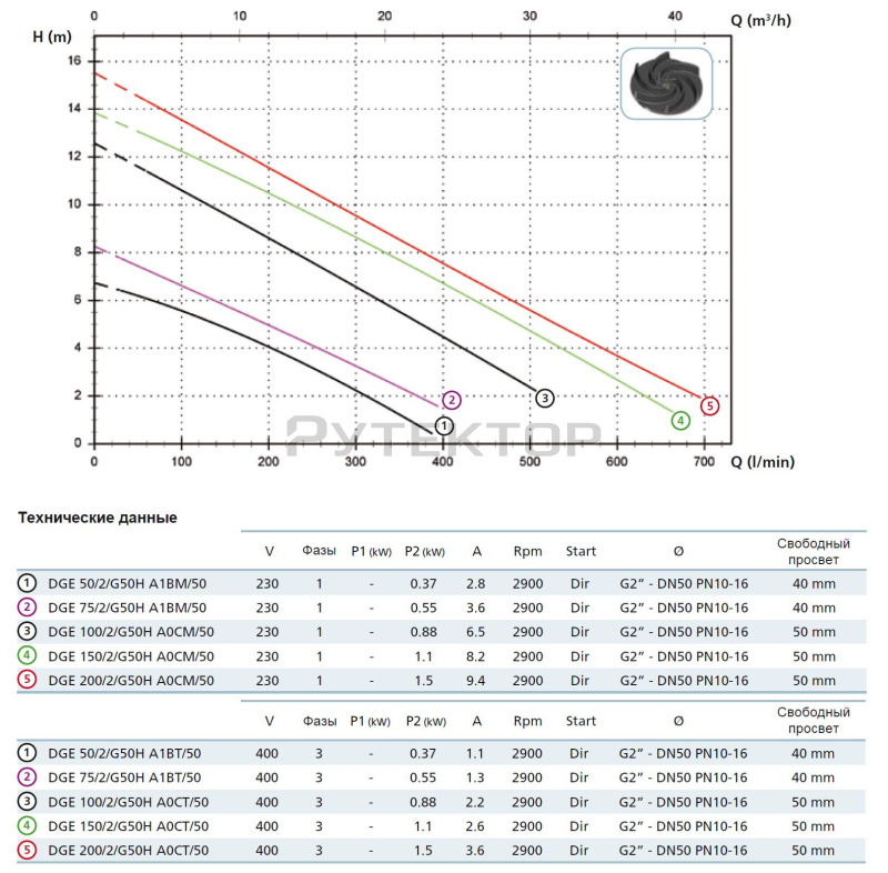 Насосные агрегаты типа DGE - погружные с глубоко посаженным рабочим колесом Vortex и вертикальным подающим патрубком. Проточная часть насоса и рабочее колесо выполнены из чугуна. Одно механическое уплотнение из карбида кремния и сальник. Электродвигатель сухого типа. Назначение: для загрязненной и канализационной воды с длинными волокнистыми и взвешенными частицами диаметром до 50 мм температурой не более 40° С; предназначен для бытового применения.
